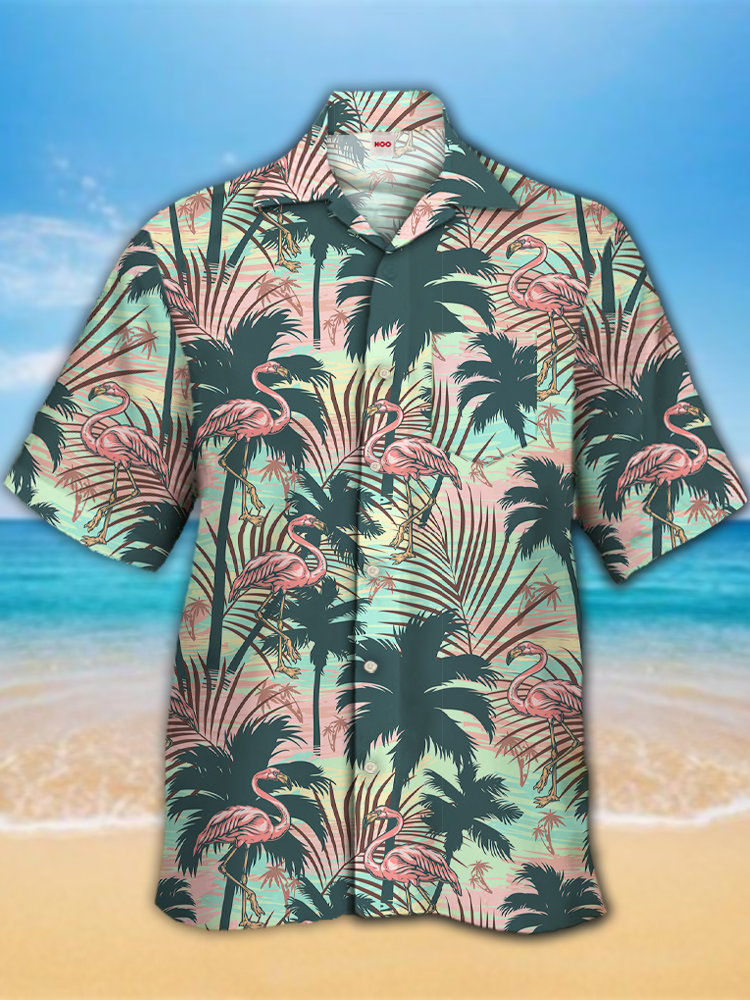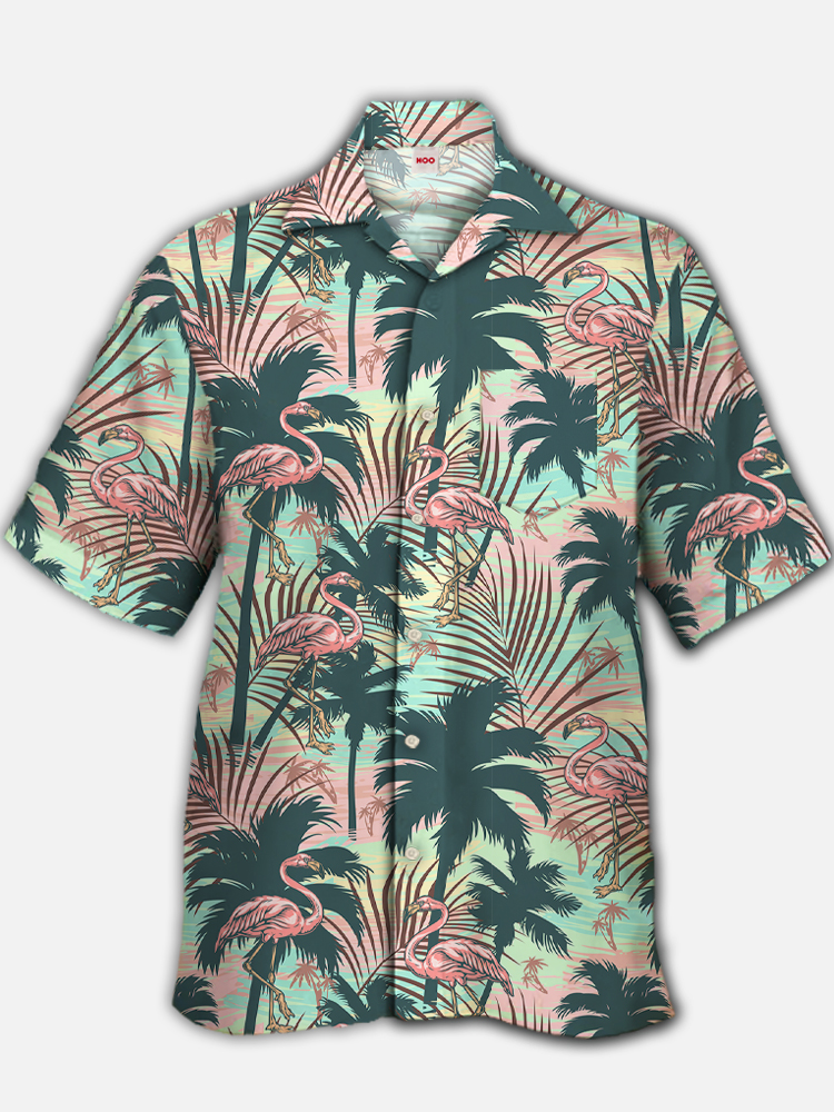 Eye-Catching Vintage Tropical Colorful Tropical Jungle And Flamingos Pattern Printing Breast Pocket Cuban Collar Hawaiian Short Sleeve Shirt
