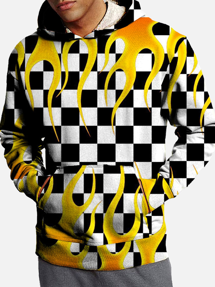 Checkerboard And Vogue Fire Flame Pattern Printing Hooded Sweatshirt