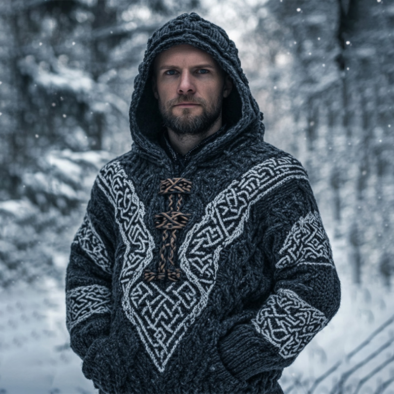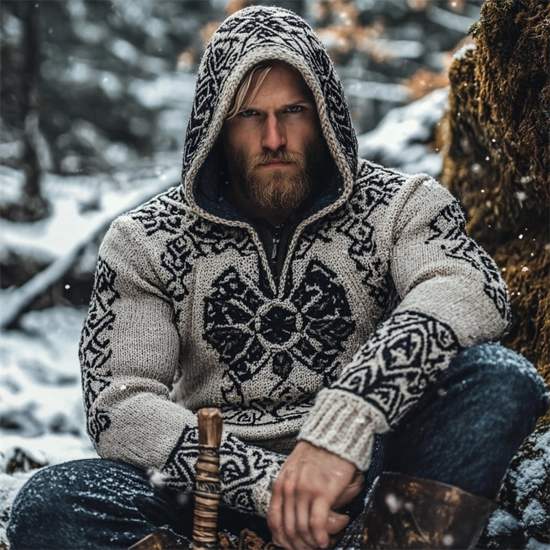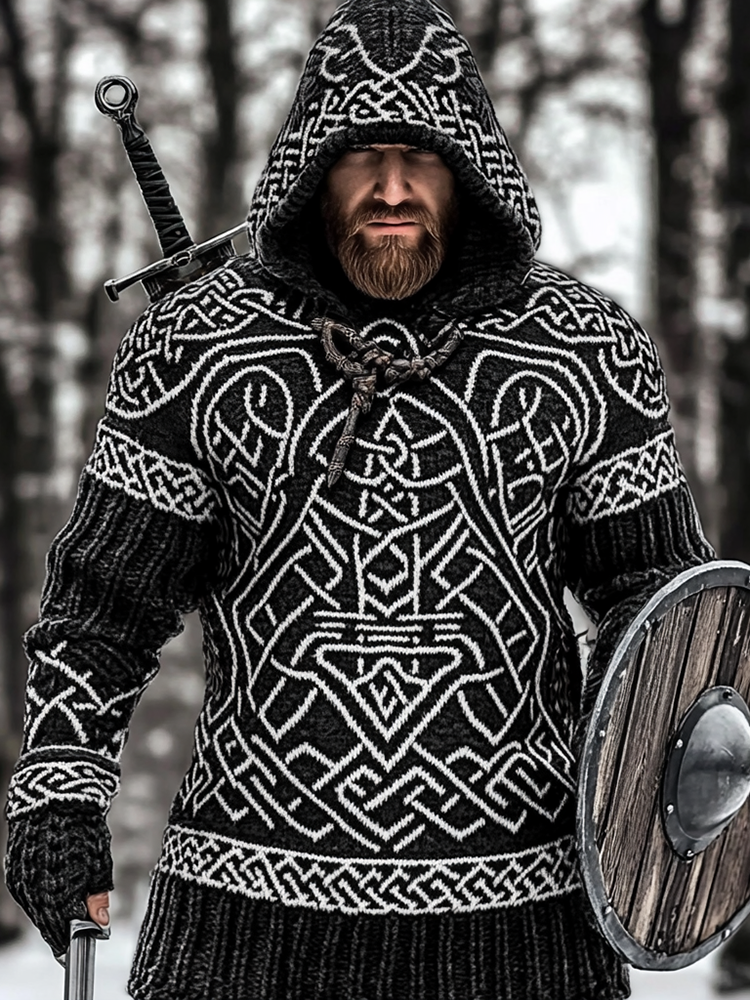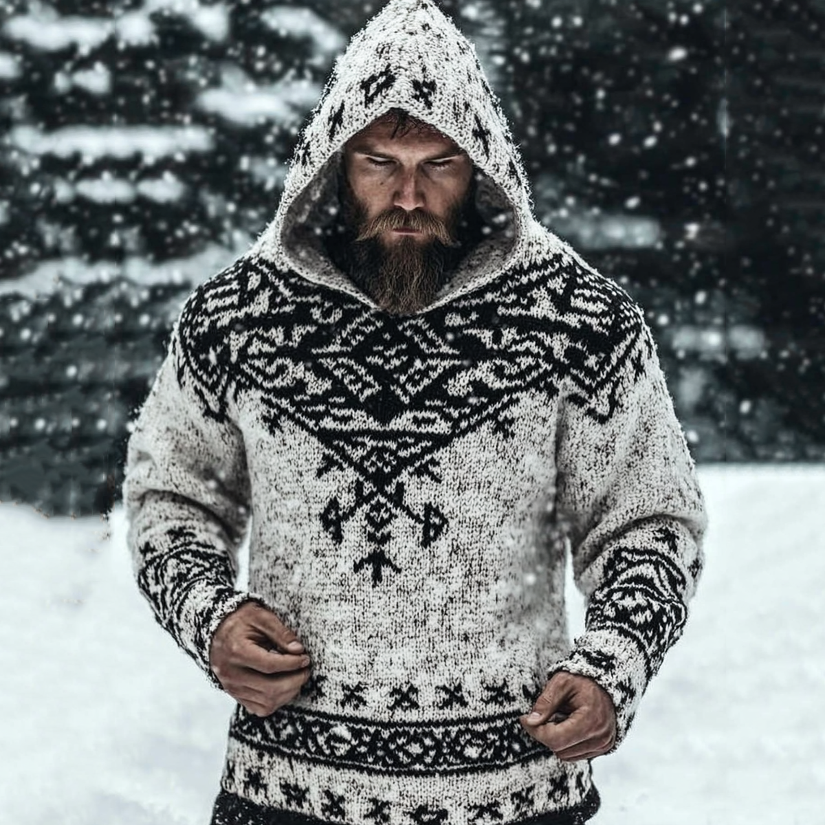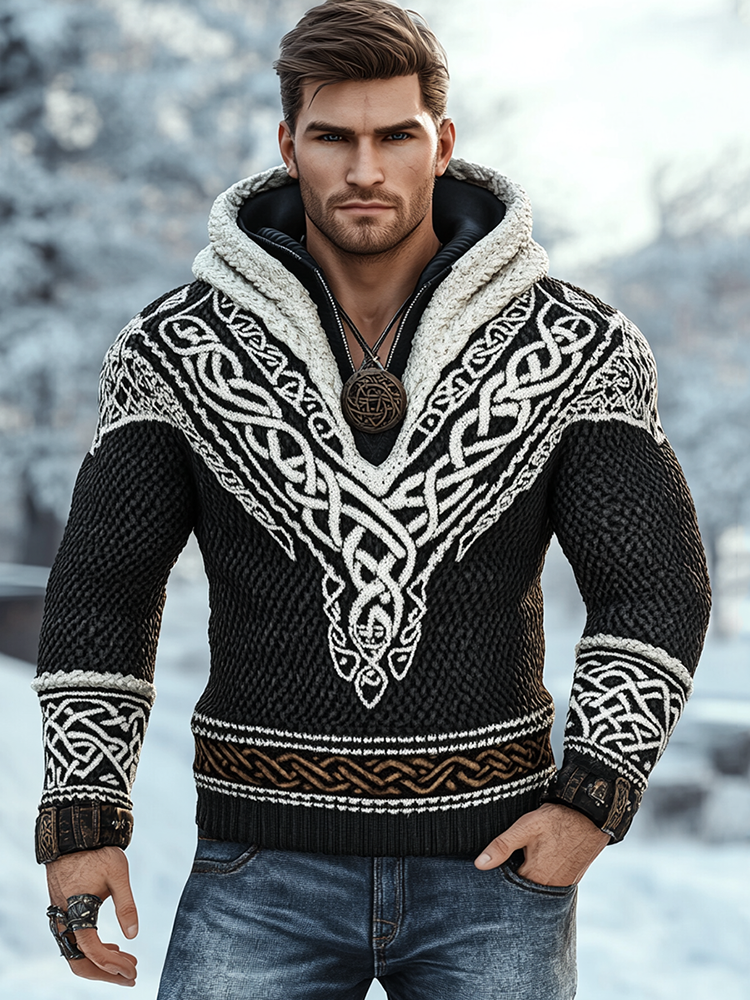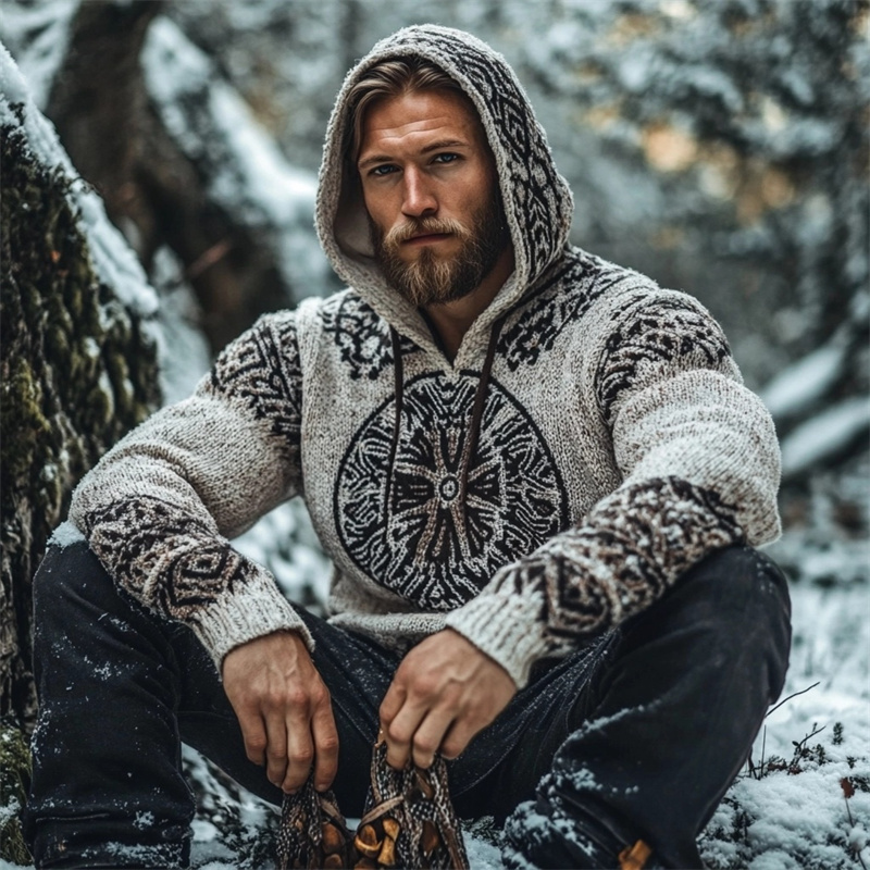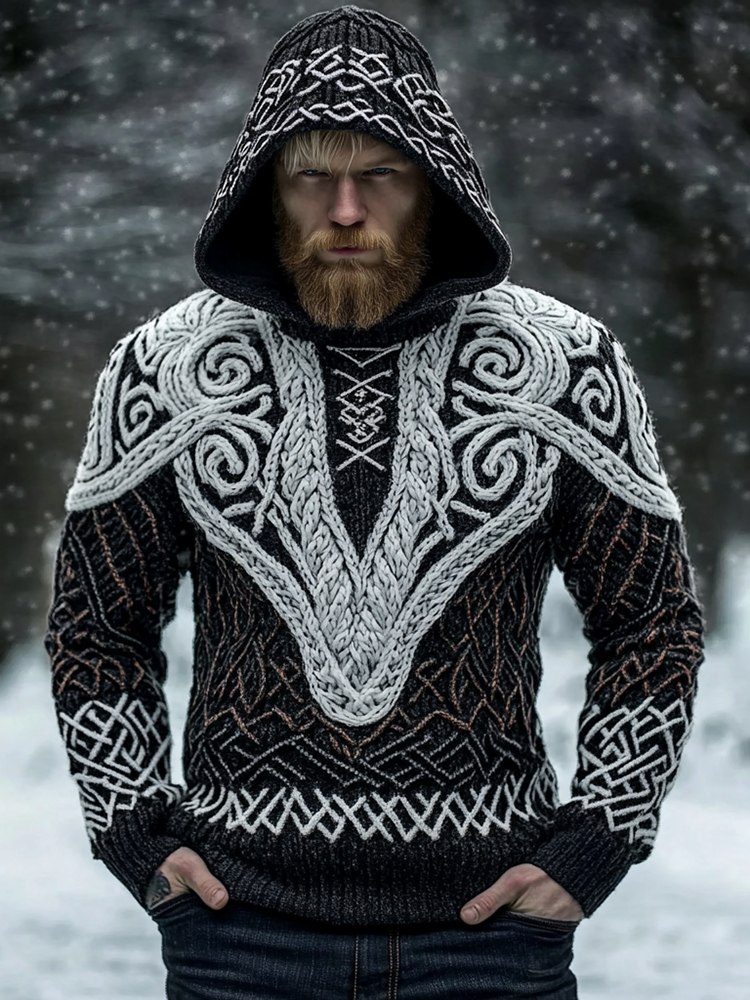 Men's Vintage Viking Inspired Jacquard Cozy Hooded Sweater
