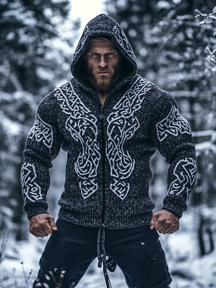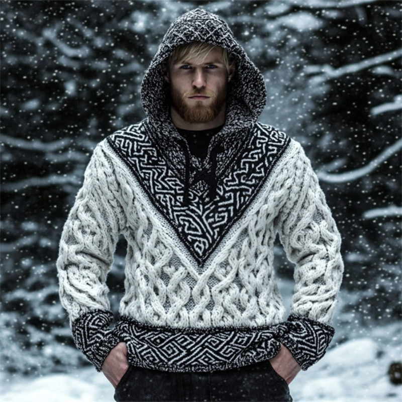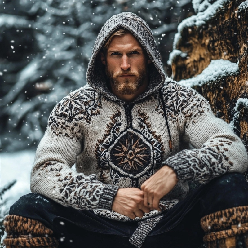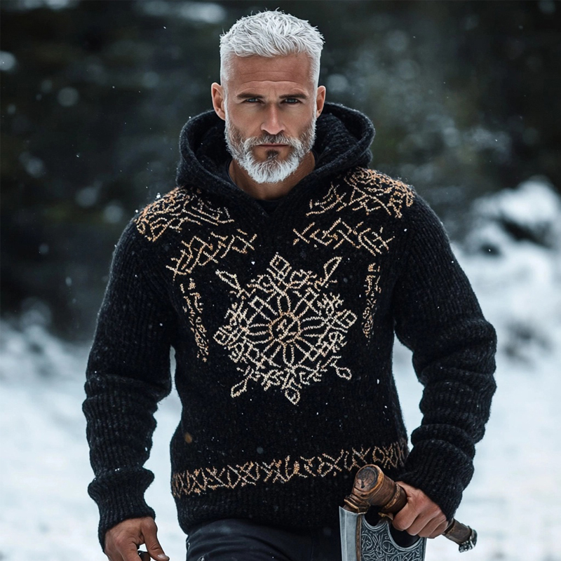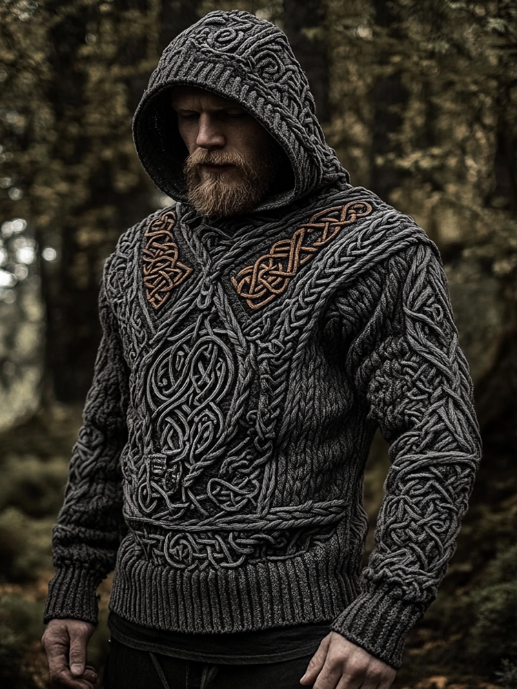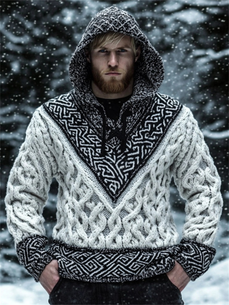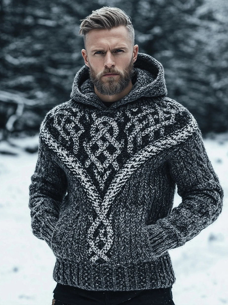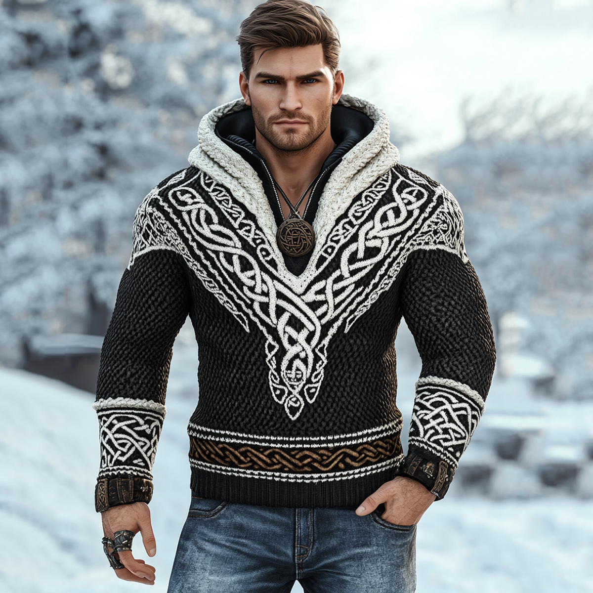 Men's Vintage Viking Inspired Jacquard Cozy Hooded Sweater