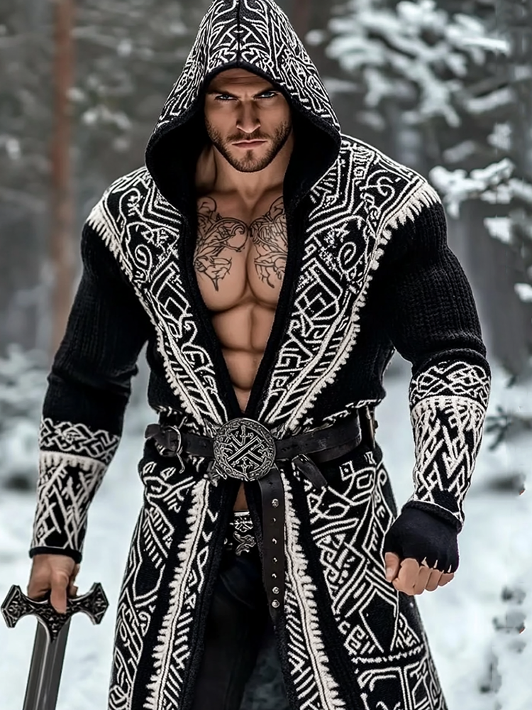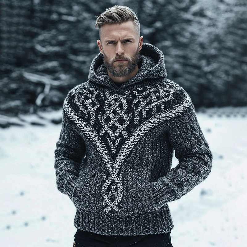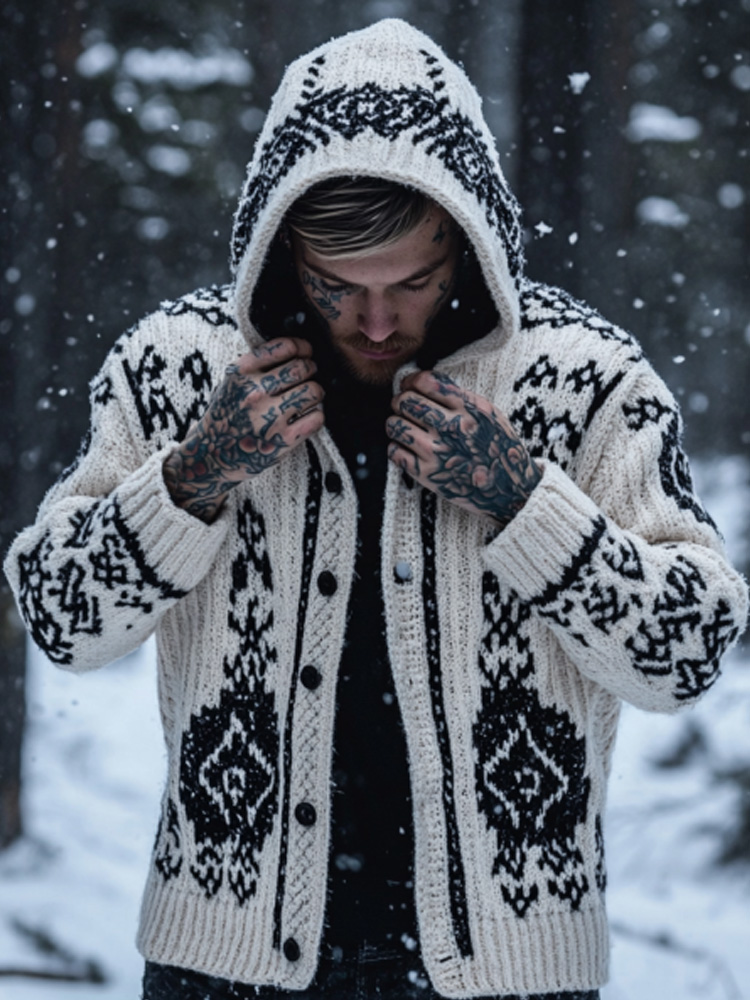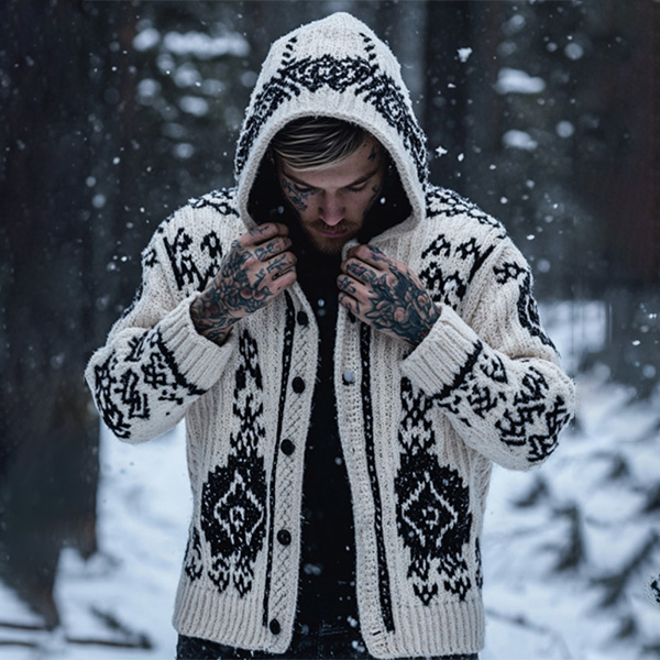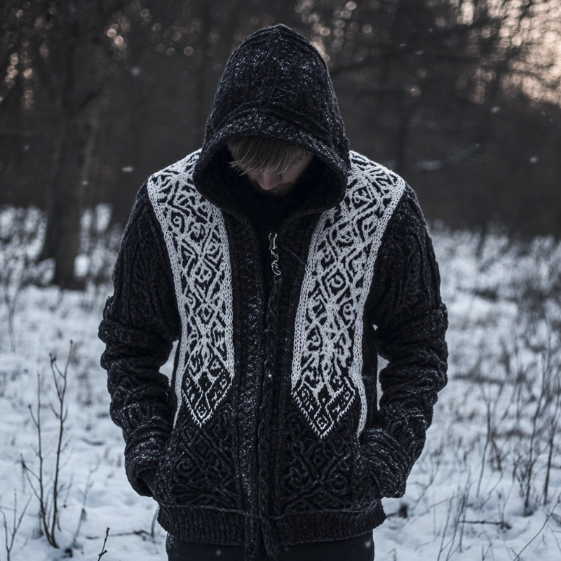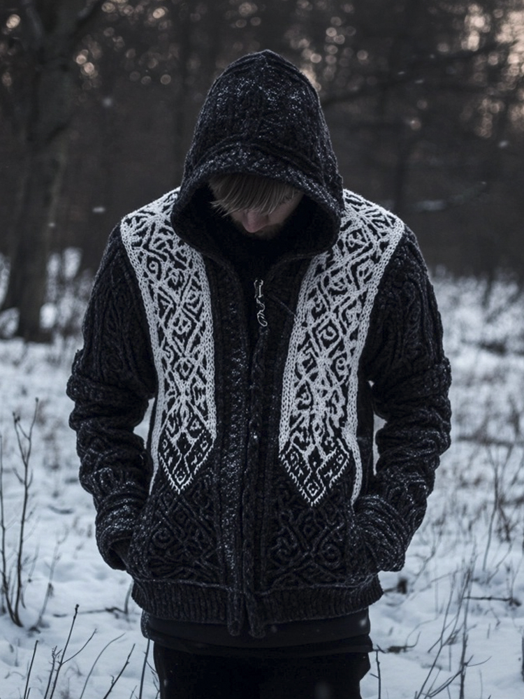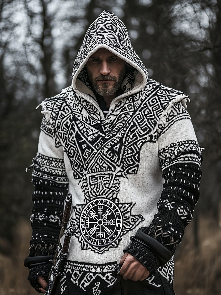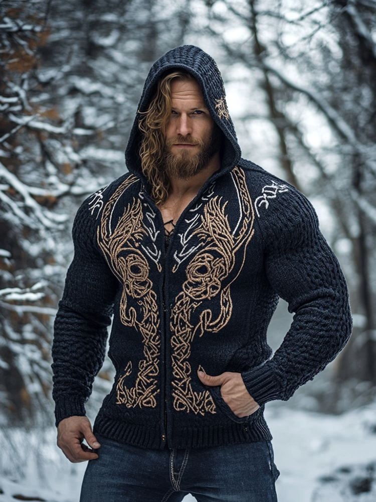 Men's Vintage Viking Inspired Jacquard Cozy Hooded Sweater