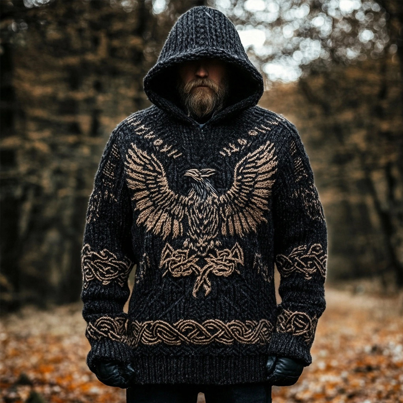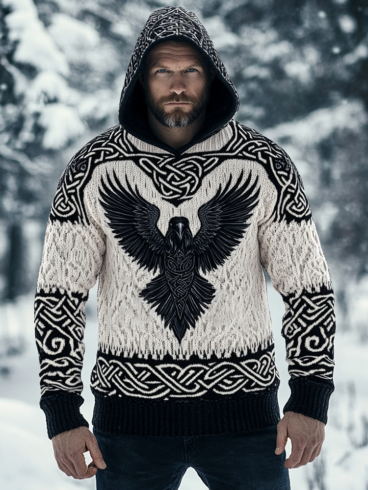 Men's Viking Raven Inspired Jacquard Cozy Hooded Sweater