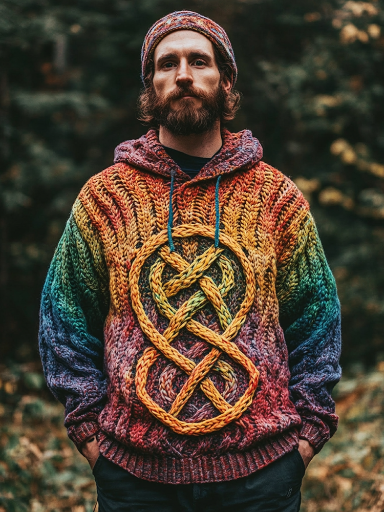 Men's Vintage Rainbow Irish Celtic Knot Jacquard Mottled Hooded Sweater