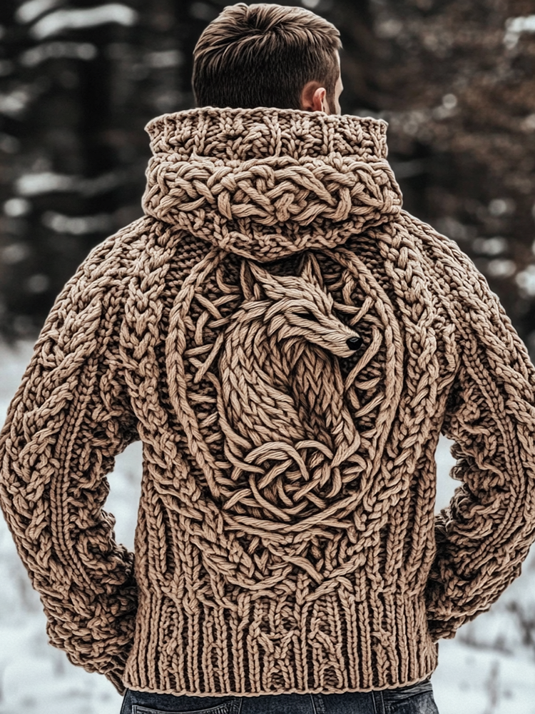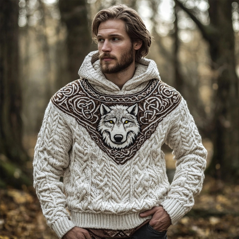 Men's Viking Wolf Celtic Jacquard Chunky Hooded Sweater