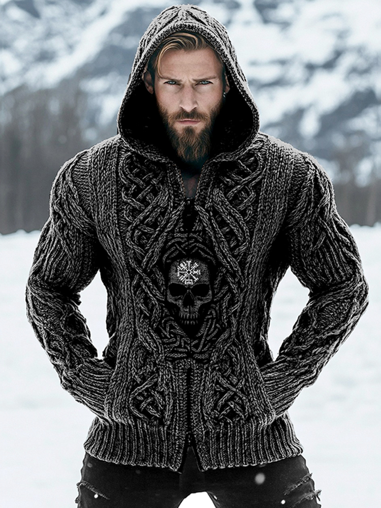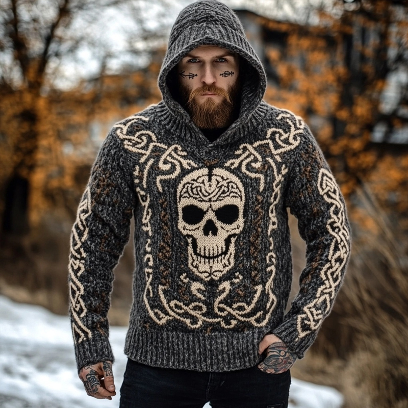 Men's Viking Inspired Skull Celtic Jacquard Cozy Hooded Sweater