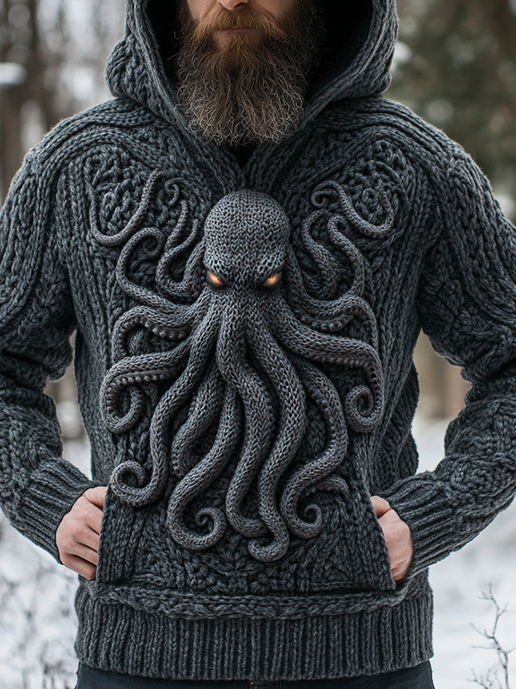 Men's Viking Tribal Cthulu Jacquard Celtic Inspired Chunky Knit Hooded Sweater