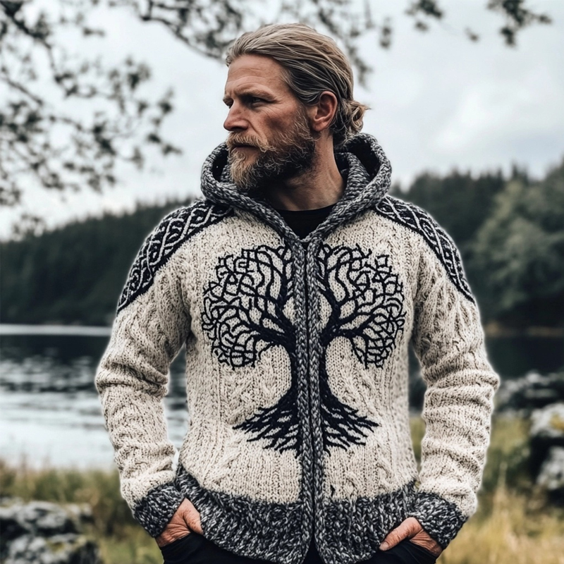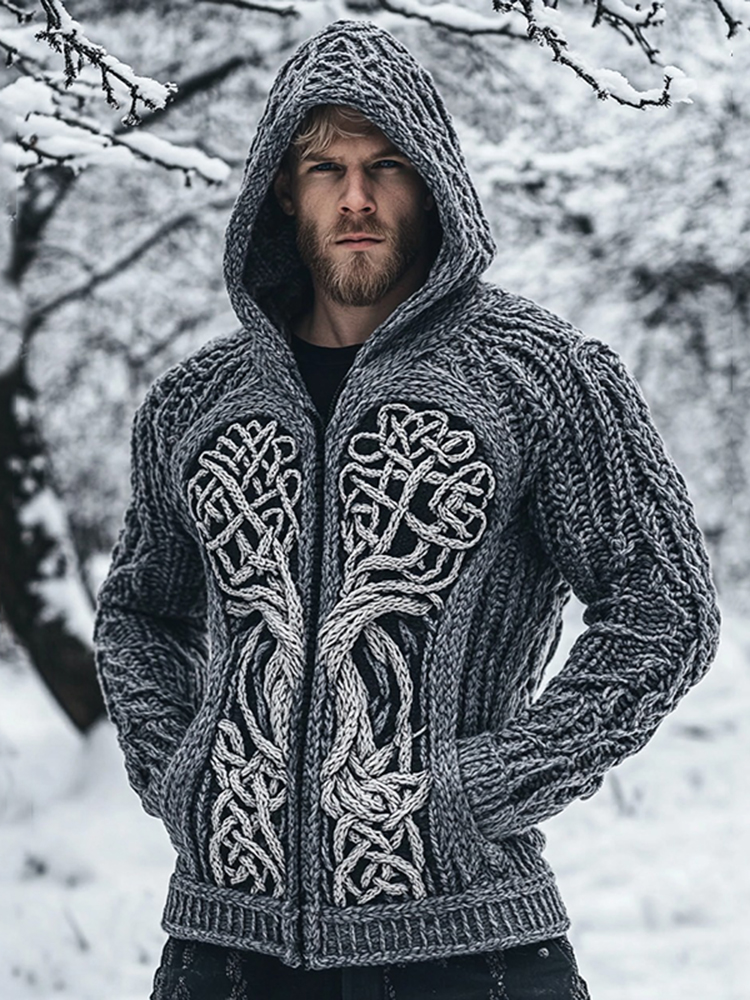 Men's Viking Tree Of Life Style Knitted Warm Hooded Cardigan Sweater