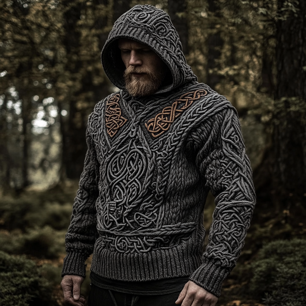 Men's Vintage Viking Inspired Celtic Jacquard Hooded Sweater