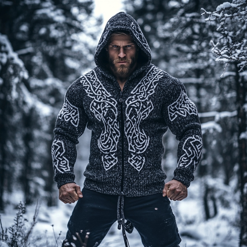 Men's Viking Rune Jacquard Celtic Knit Zip-up Hooded Sweater