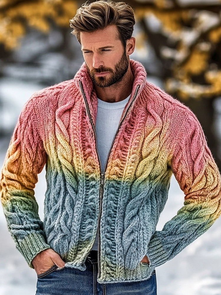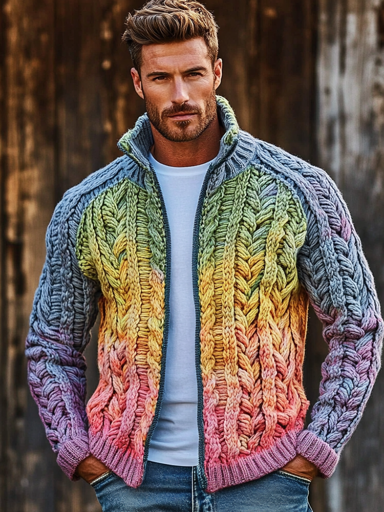 Men's Vintage Rainbow Cable Knit Gradient Zip Cozy Sweater