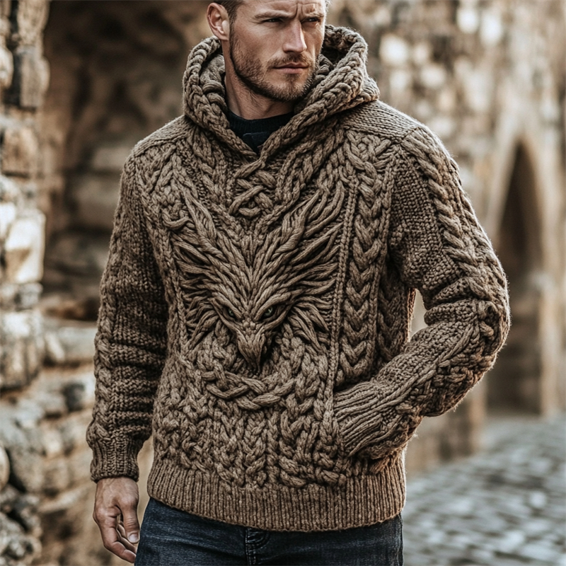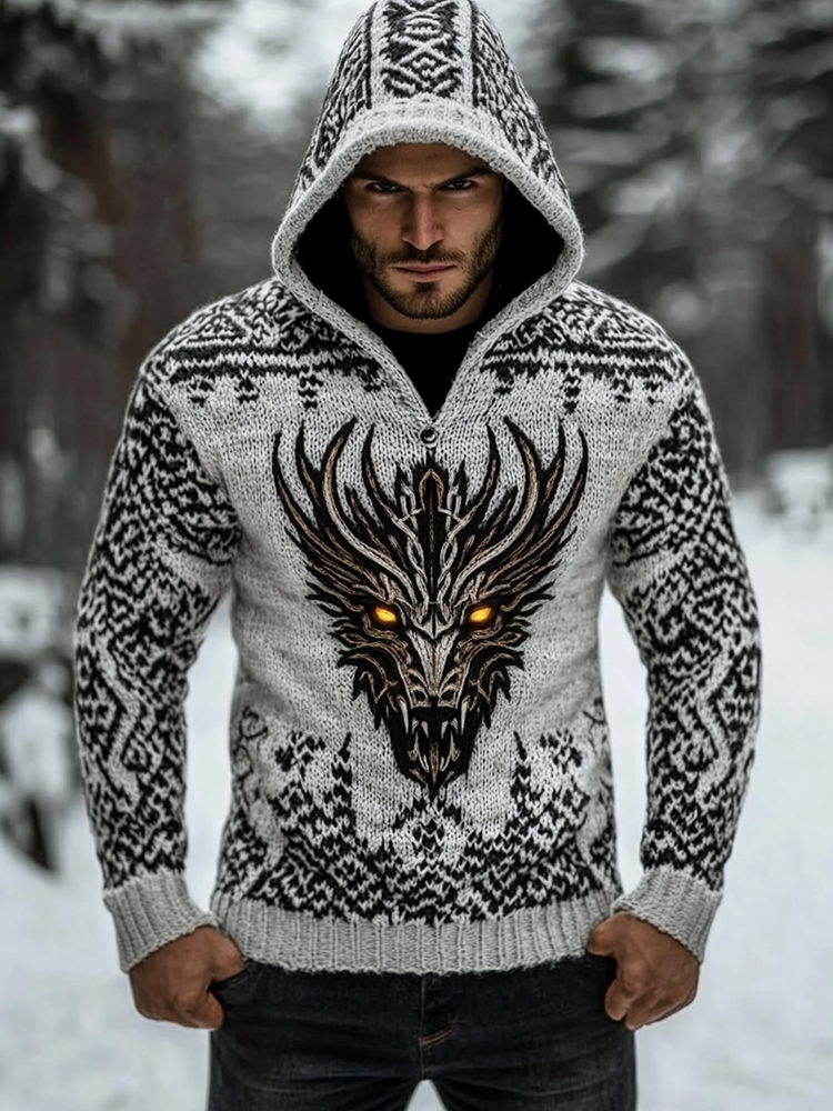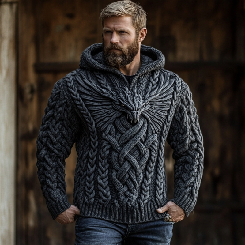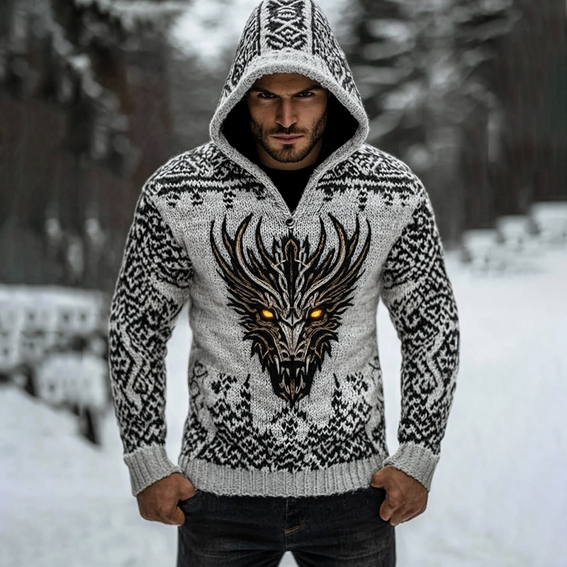 Men's Viking Dragon Pattern Art Knit Hooded Sweater