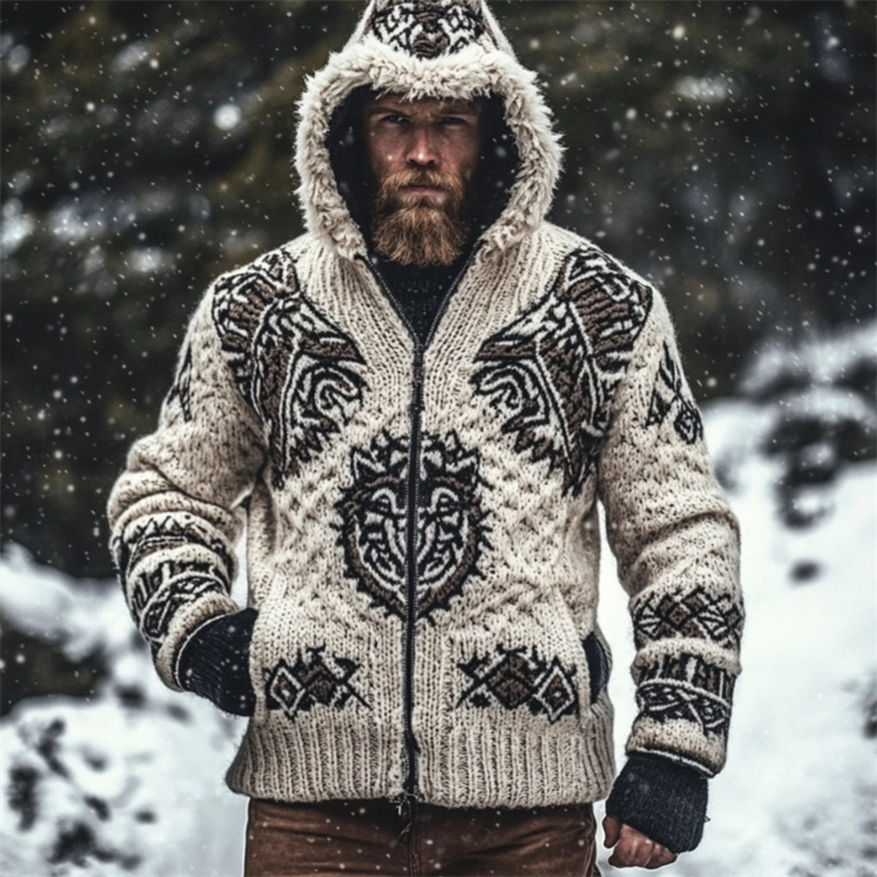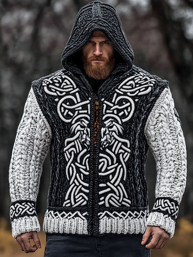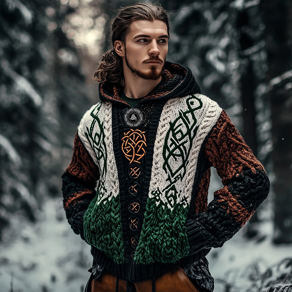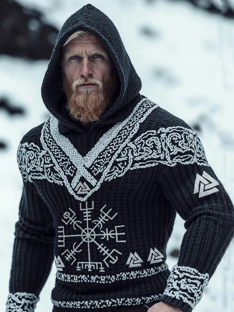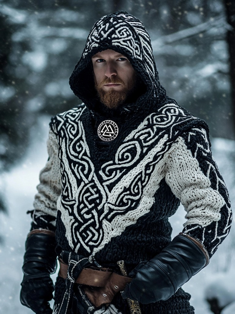 Men's Vintage Viking Inspired Celtic Jacquard Hooded Sweater