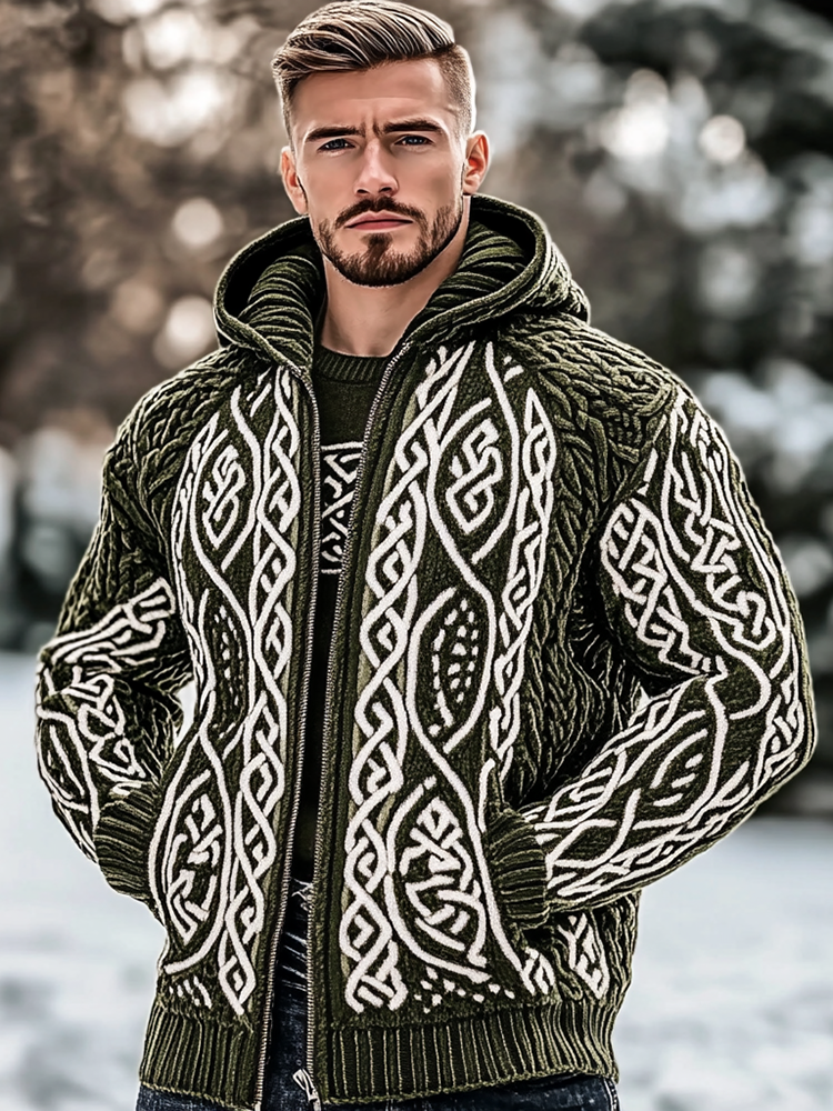 Men's Celtic Knot Jacquard Vintage Knit Hooded Cardigan