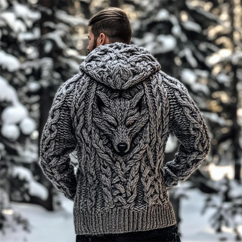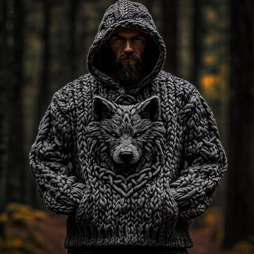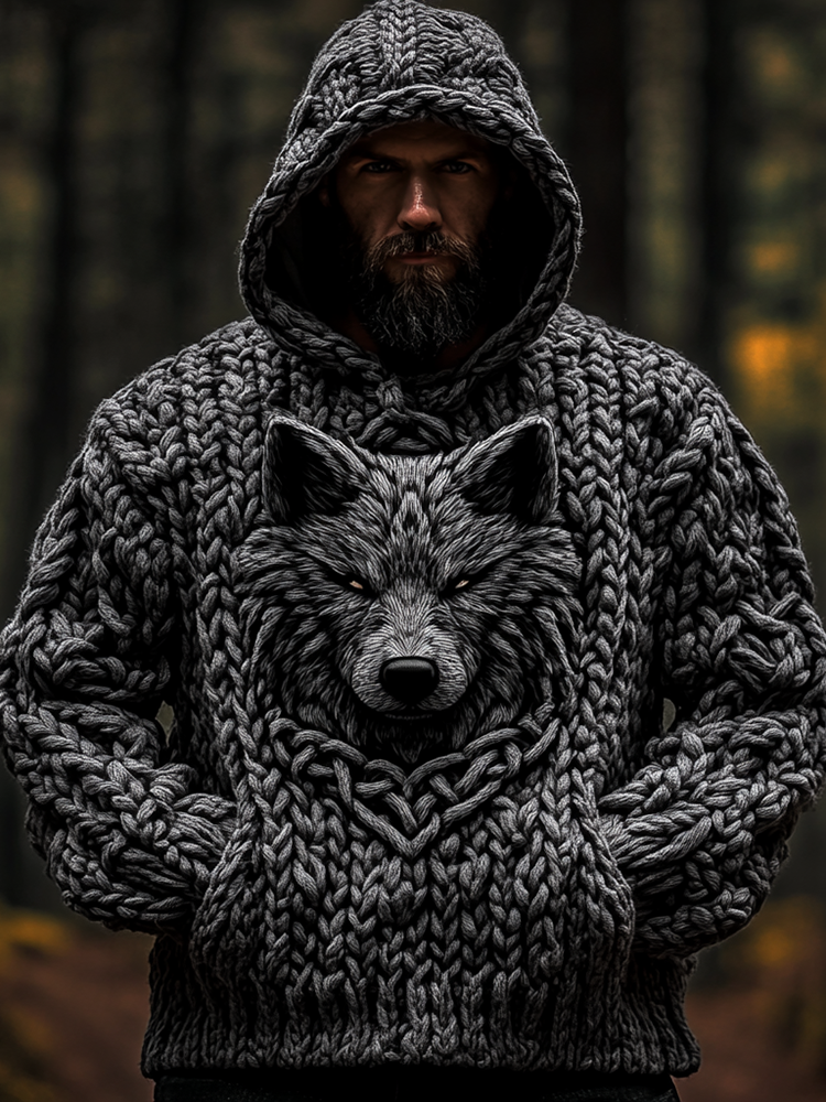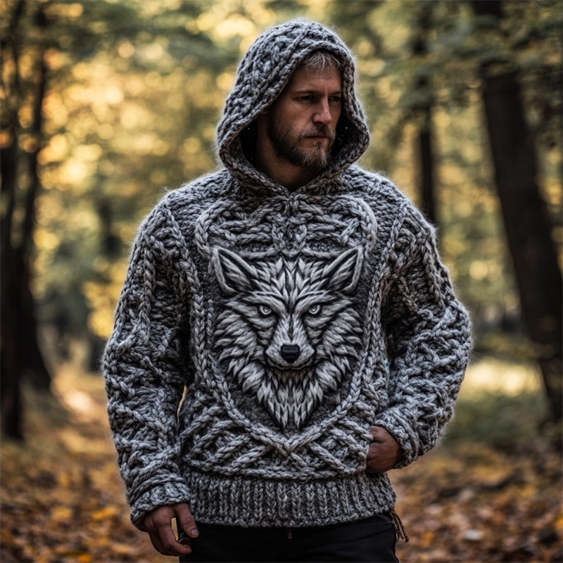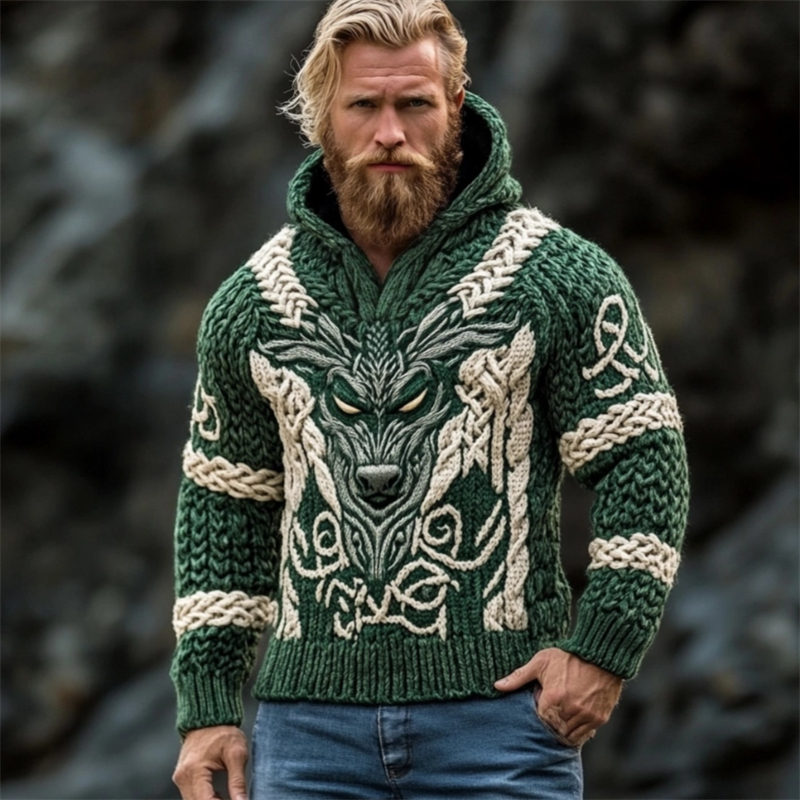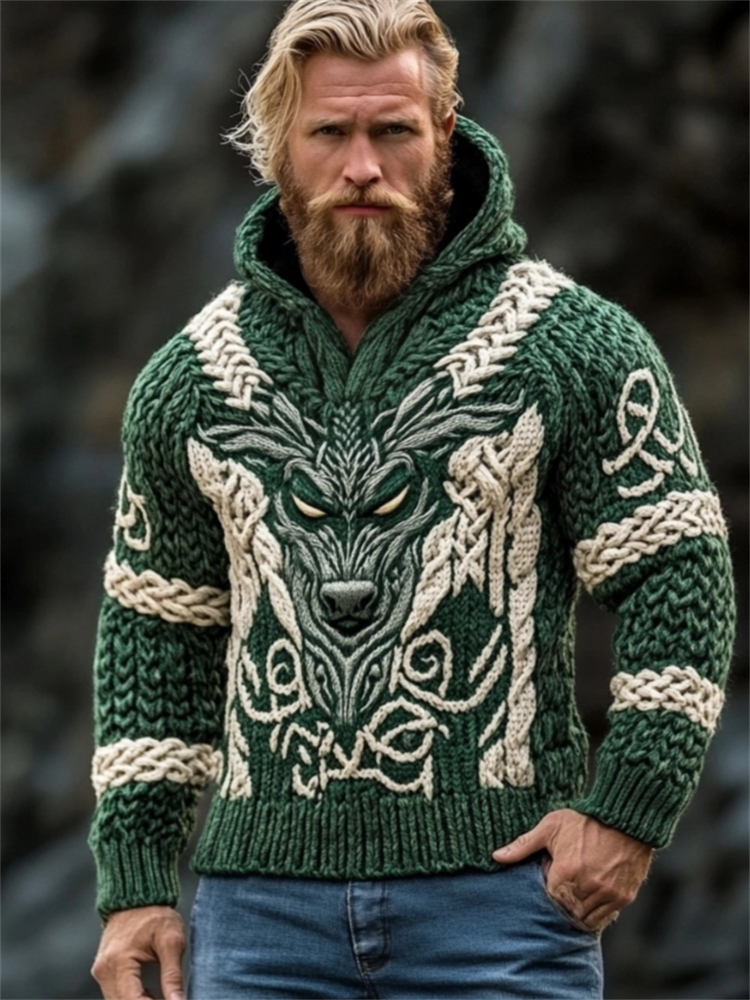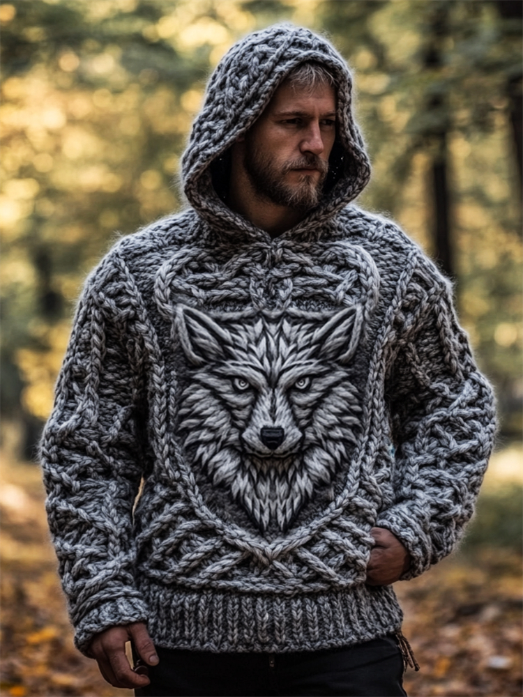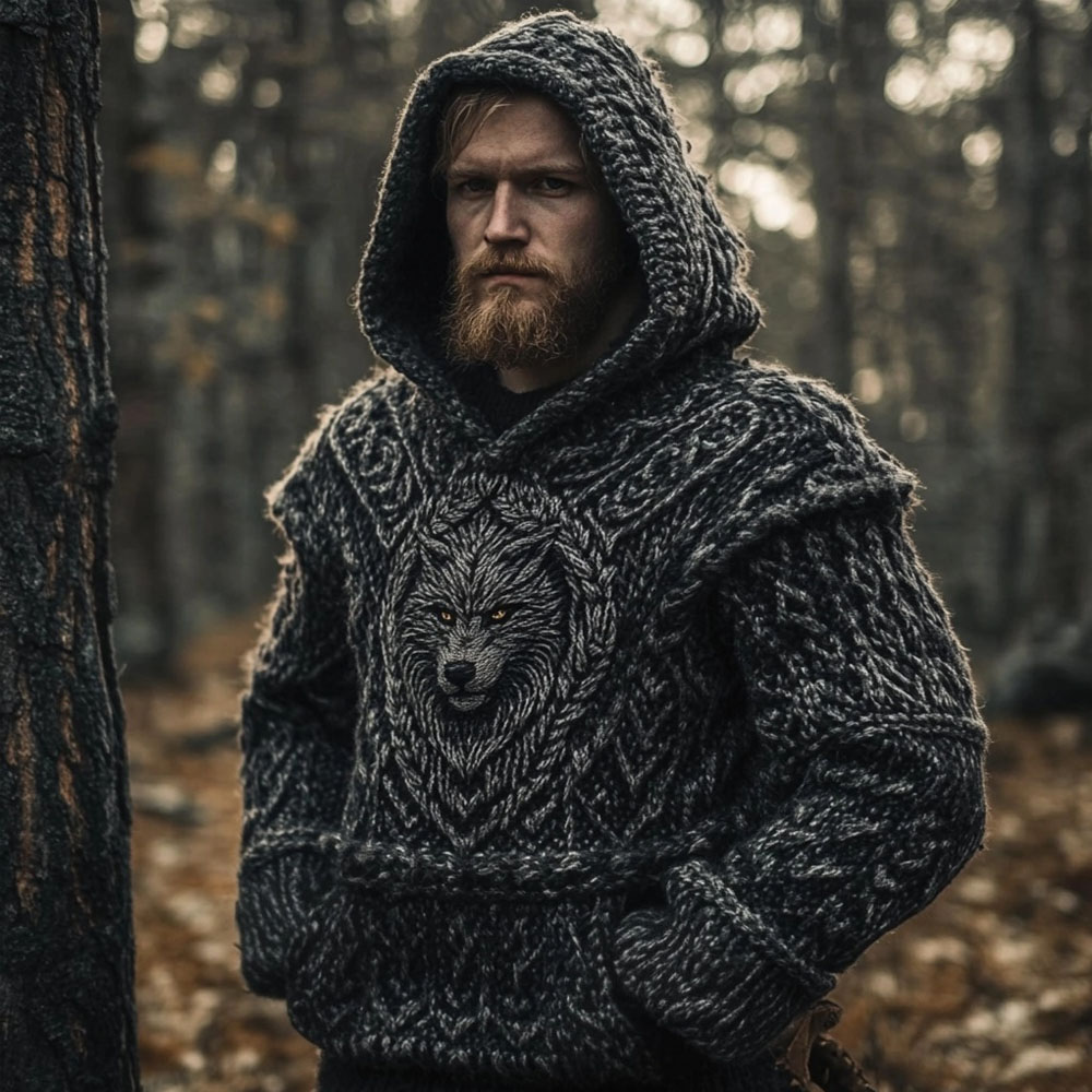 Men's Wolf Inspired Viking Celtic Jacquard Chunky Hooded Sweater