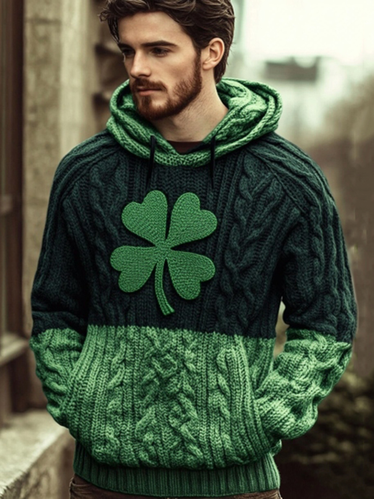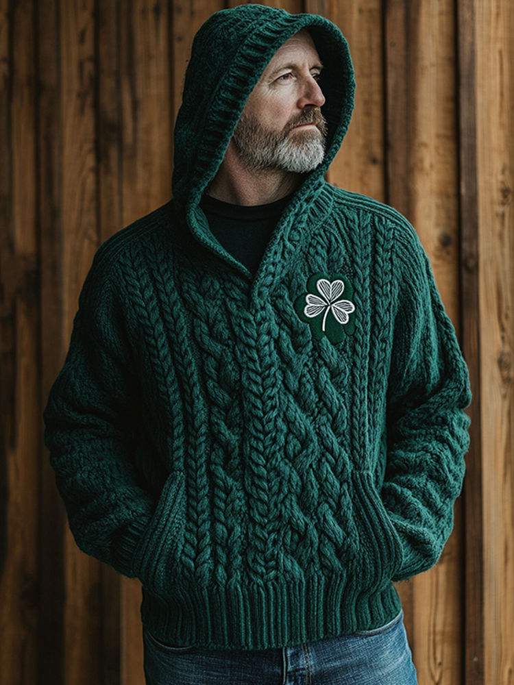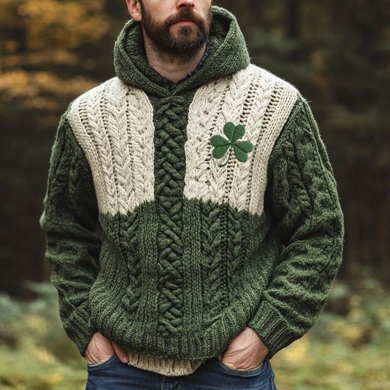 Men's Shamrock Embroidered Celtic Jacquard Contrast Color Hooded Sweater