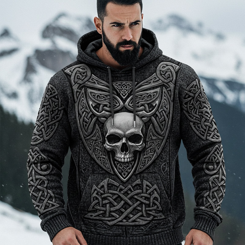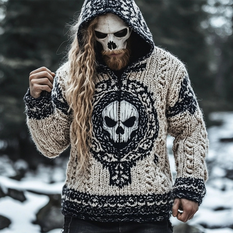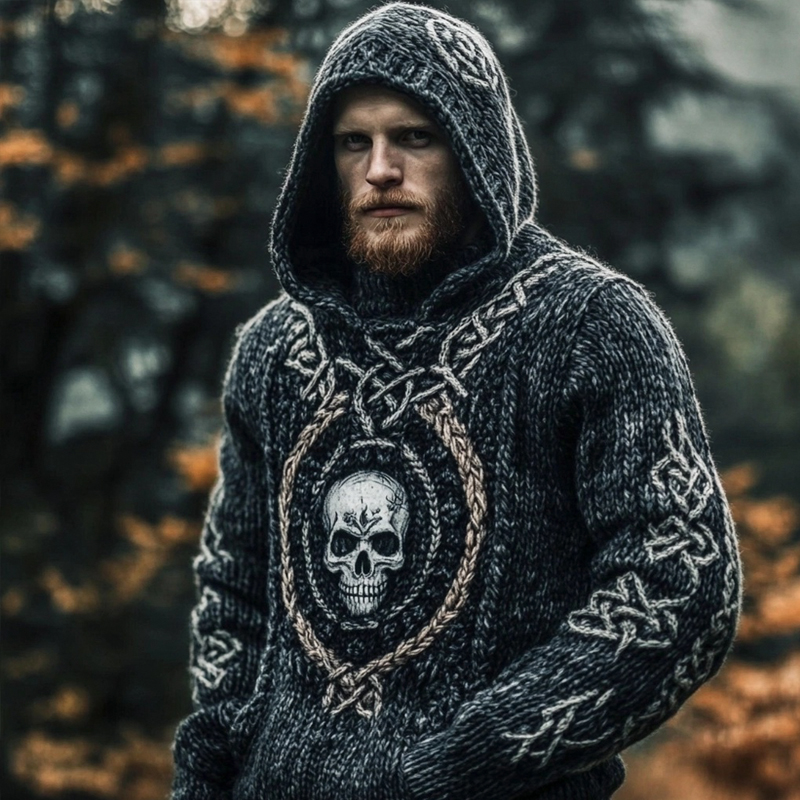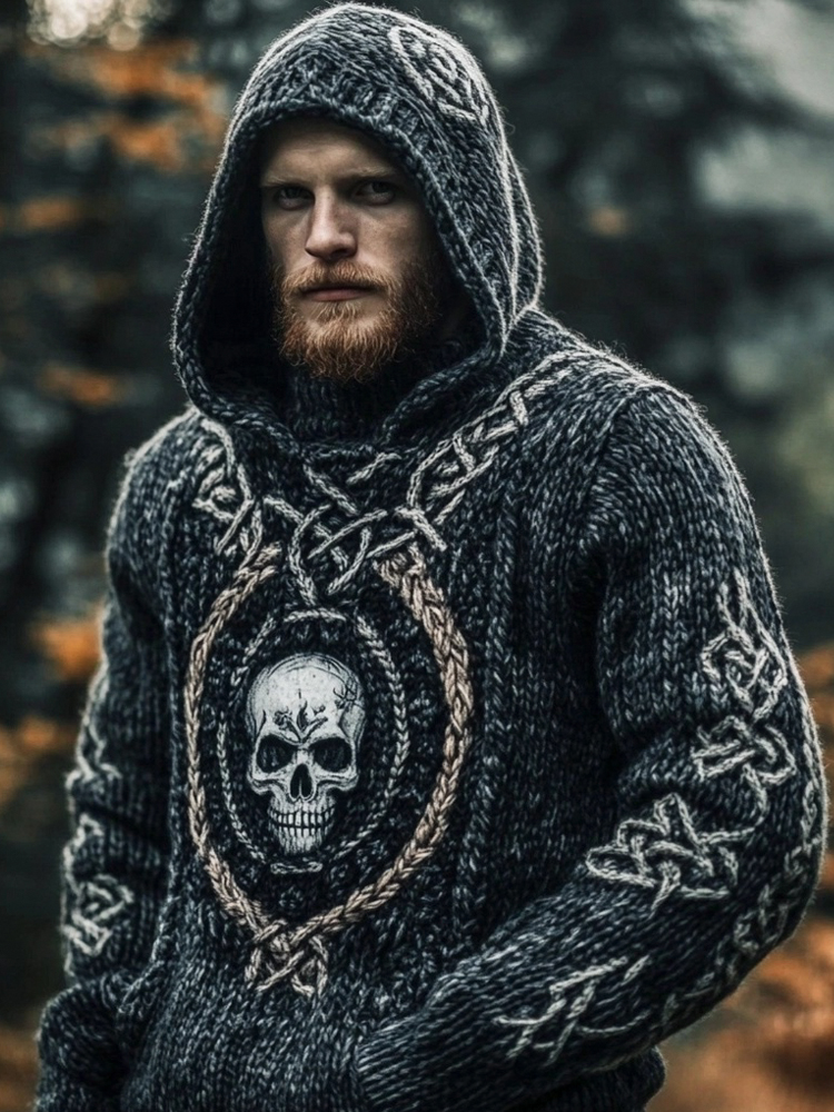 Men's Viking Tribal Skull Rune Celtic Inspired Knit Hooded Sweater