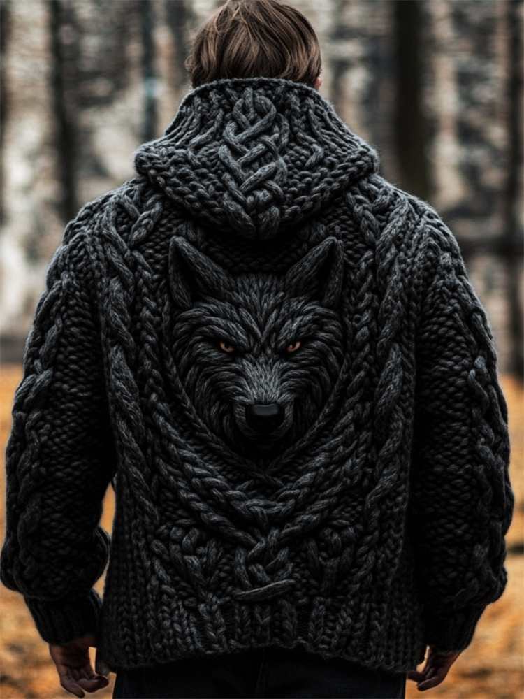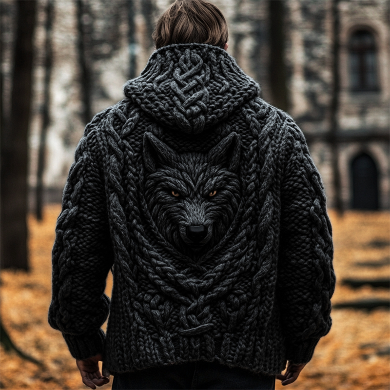 Men's Viking Fenrir Wolf Inspired Cozy Chunky Hooded Cardigan