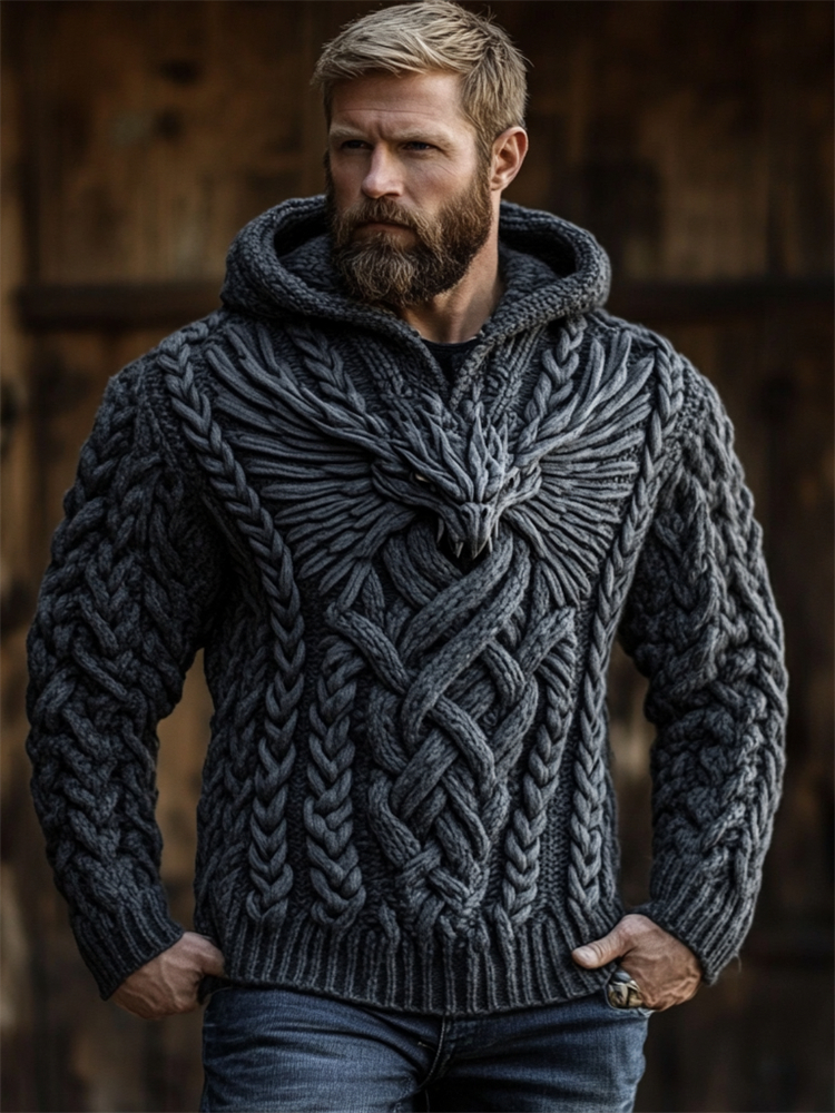 Men's Viking Tribal Eagle Jacquard Celtic Inspired Chunky Knit Hooded Sweater