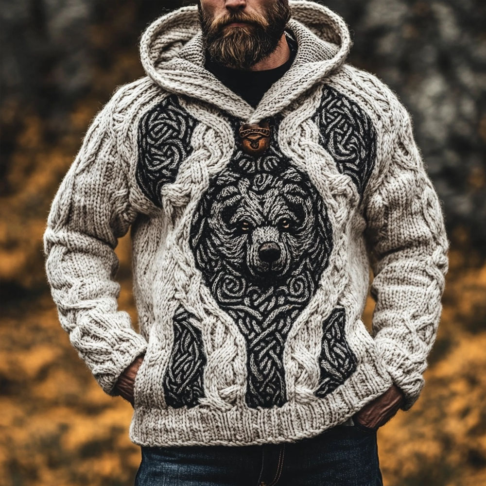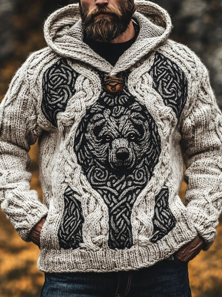 Men's Bear Inspired Viking Celtic Jacquard Chunky Hooded Sweater
