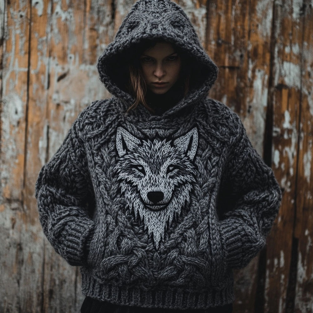 Vintage Wolf Inspired Viking Celtic Jacquard Chunky Hooded Sweater