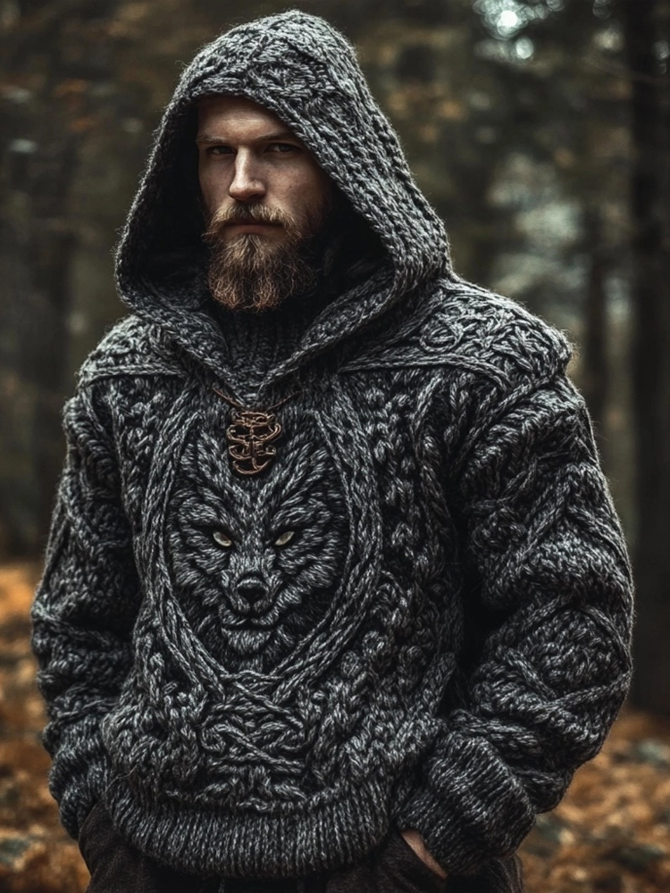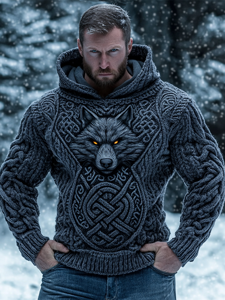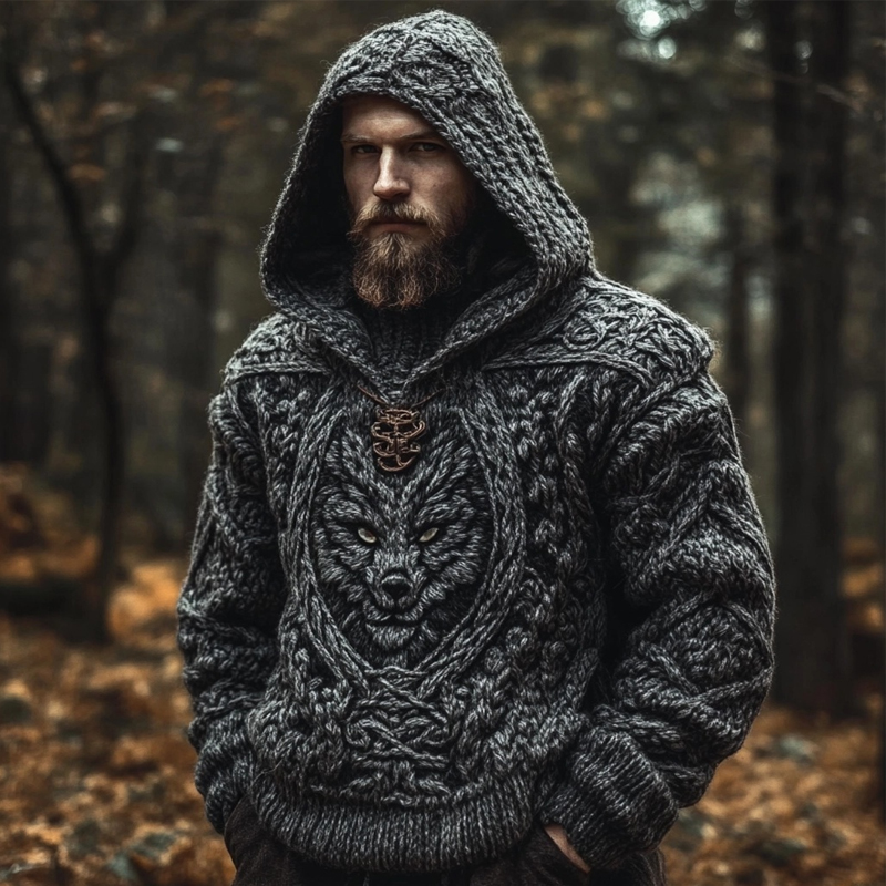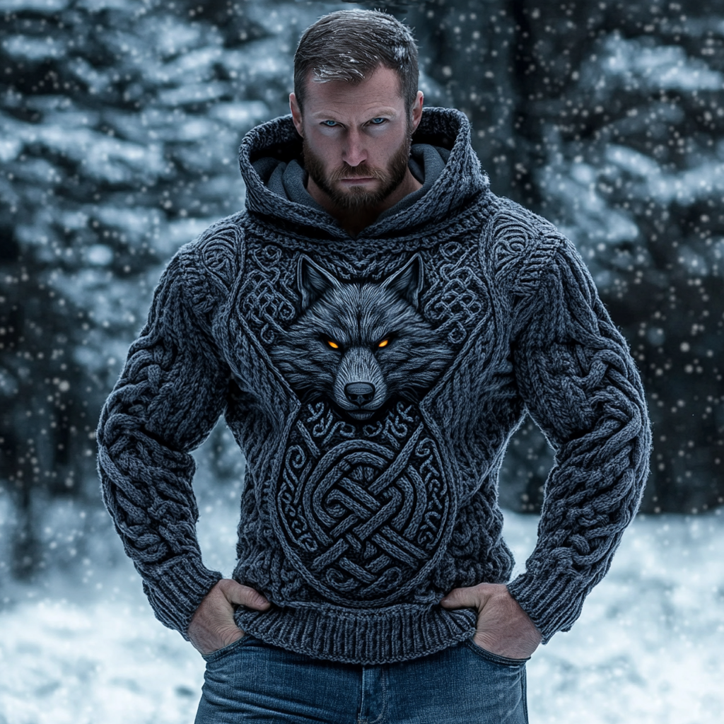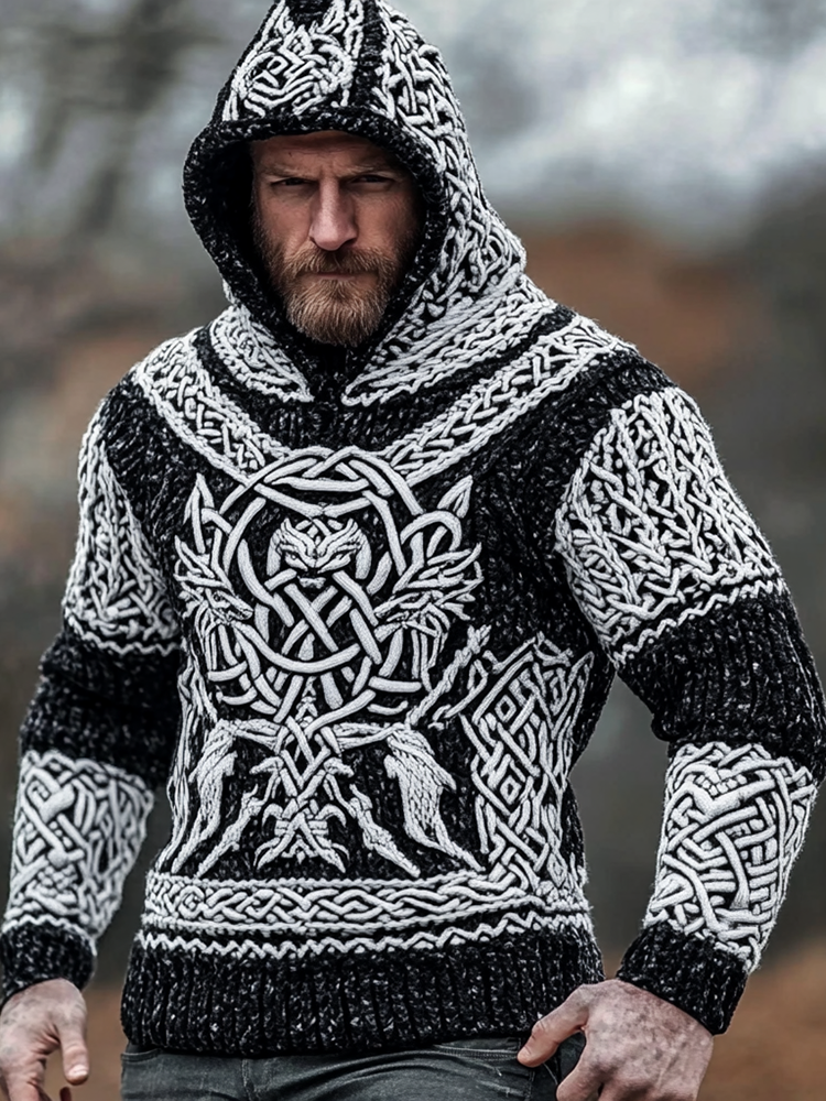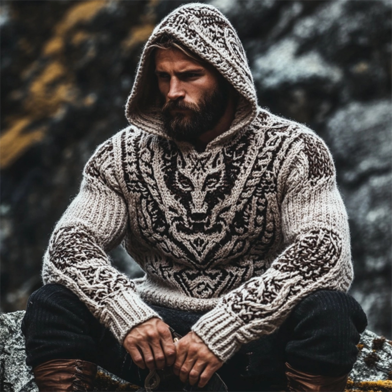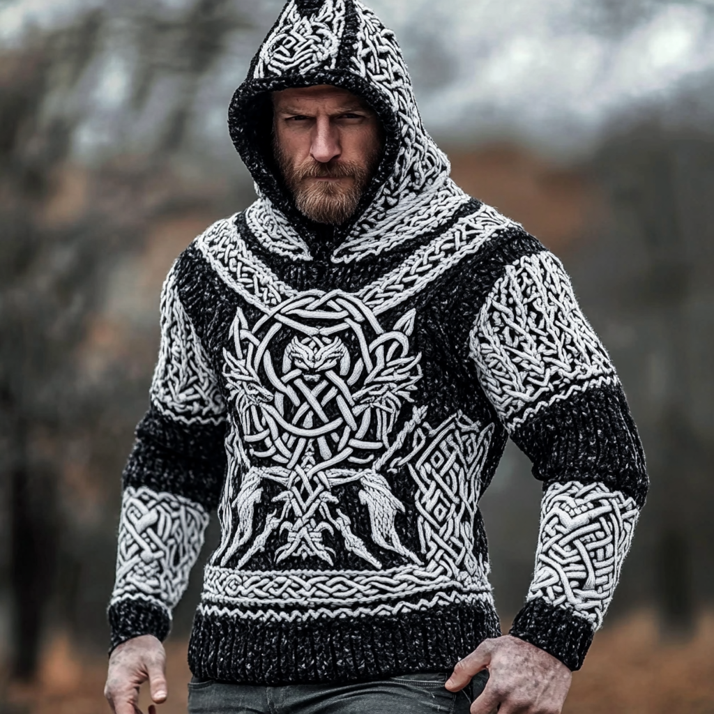 Men's Wolf Inspired Viking Celtic Jacquard Cozy Hooded Sweater