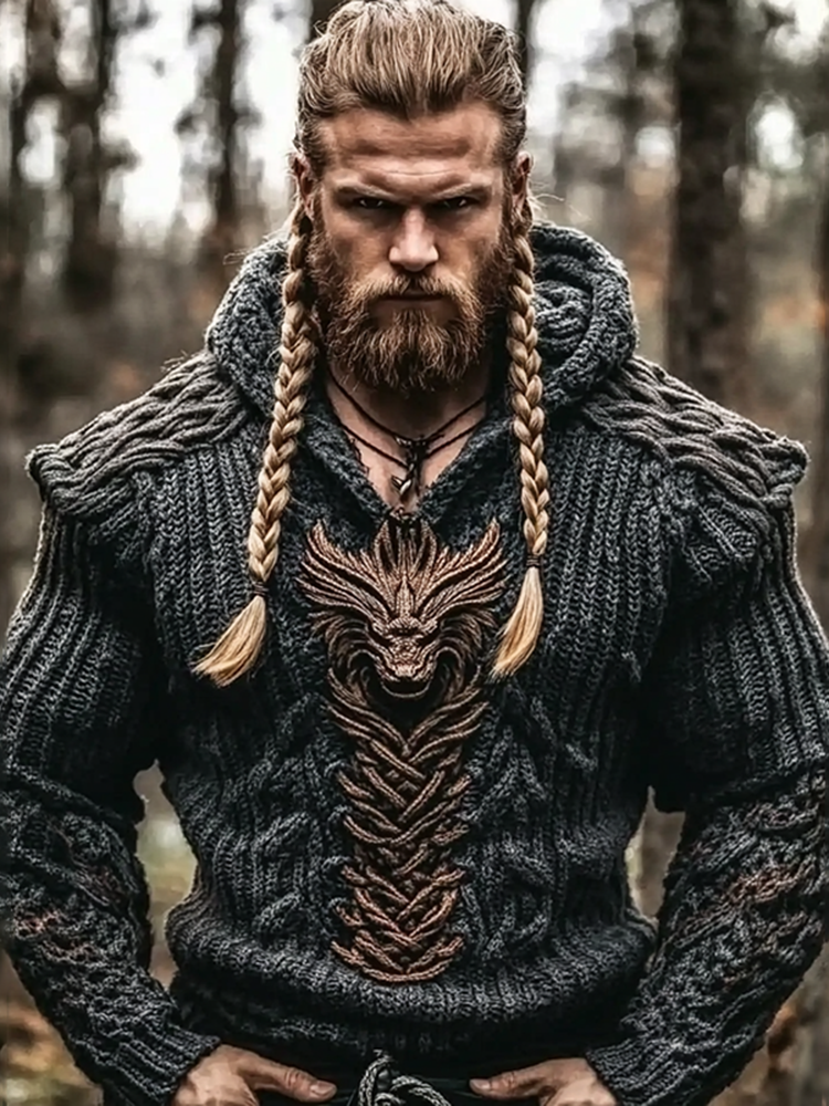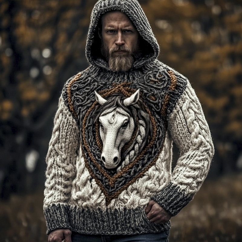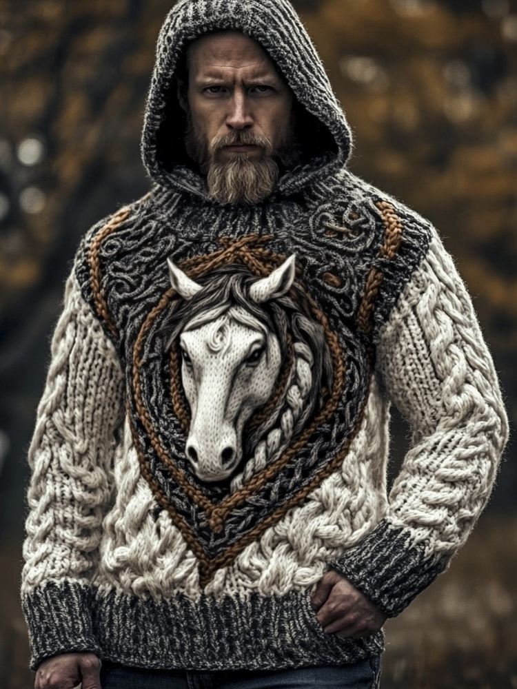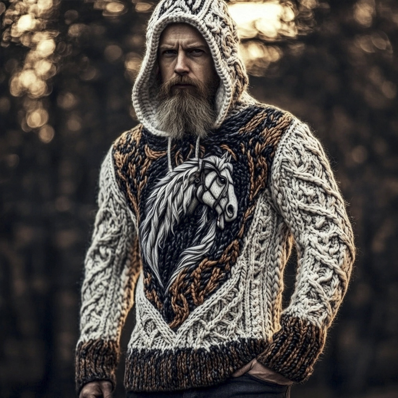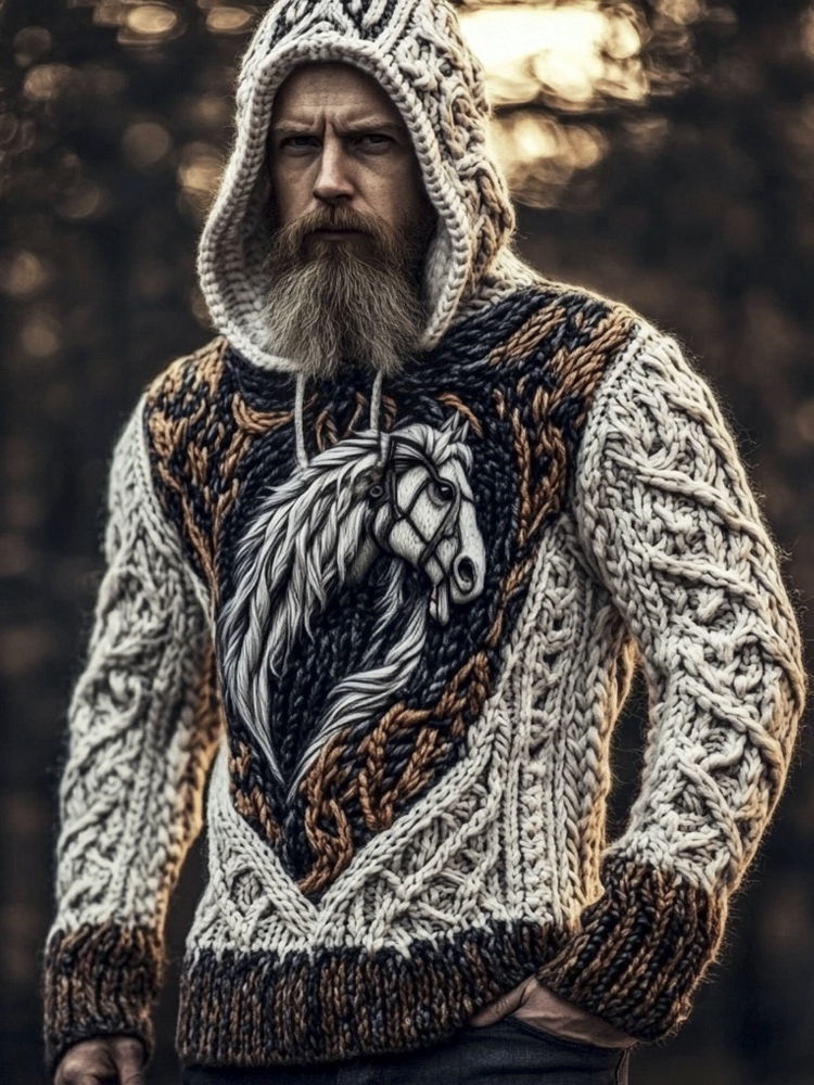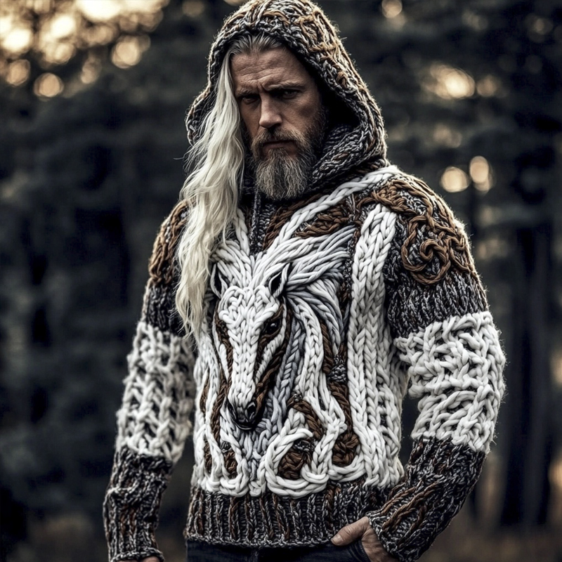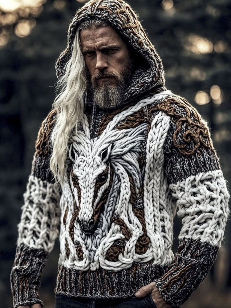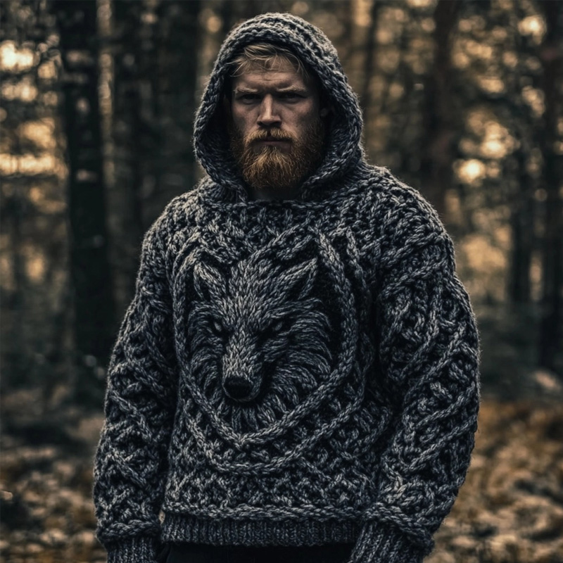 Men's Wolf Inspired Viking Celtic Jacquard Cozy Hooded Sweater
