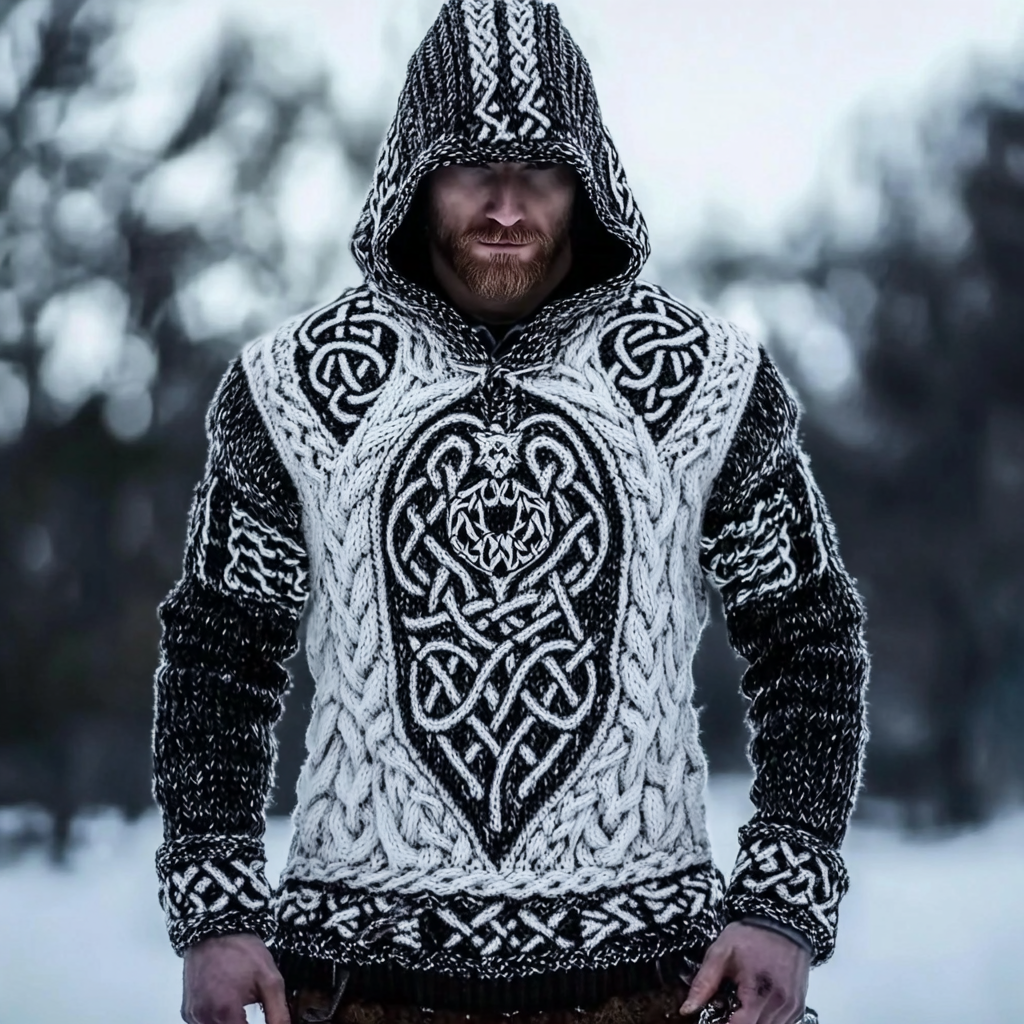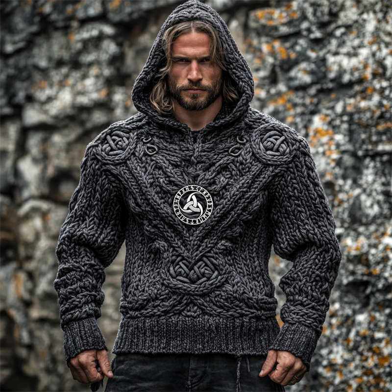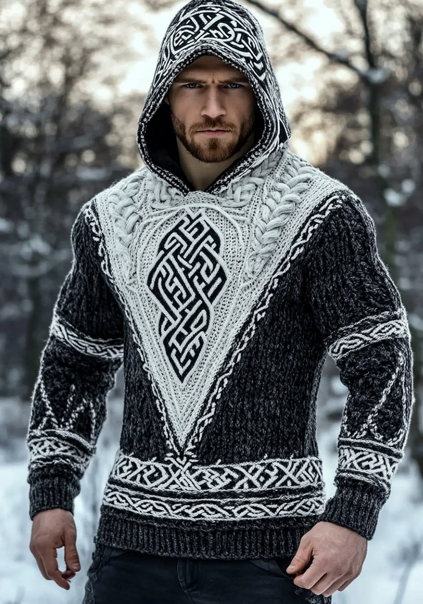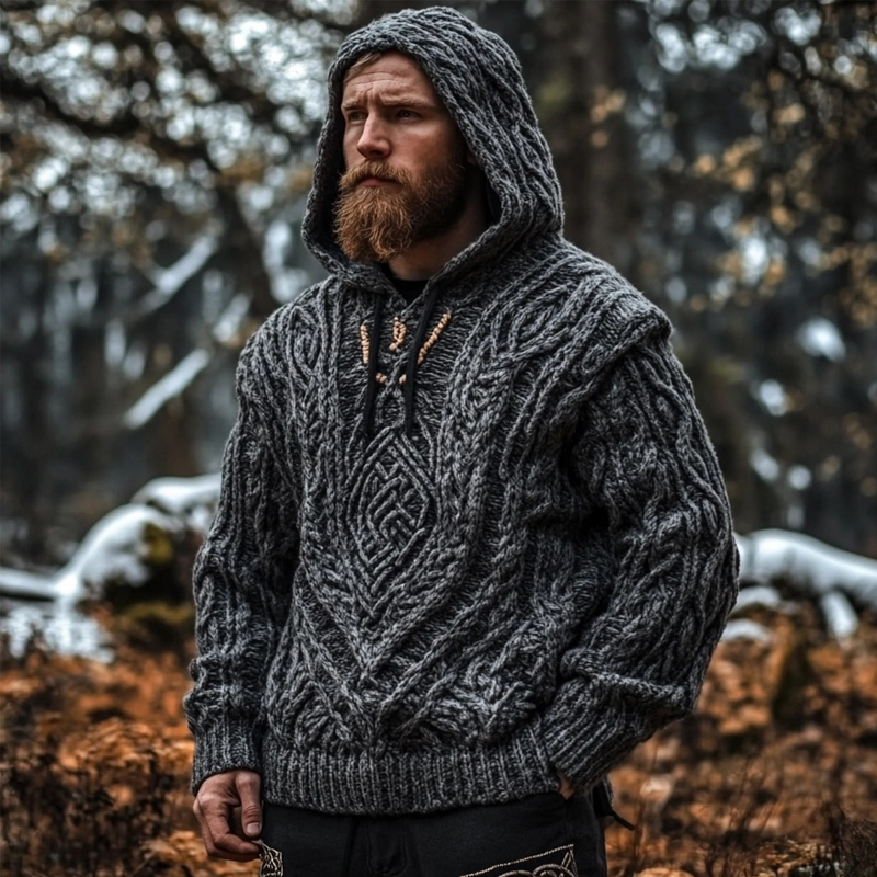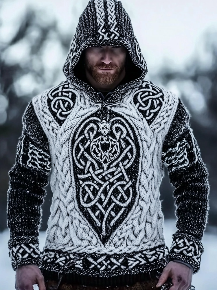 Men's Vintage Viking Celtic Jacquard Chunky Hooded Sweater