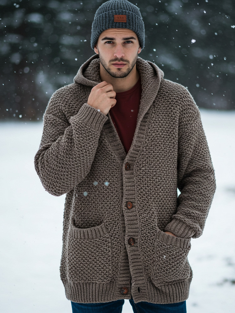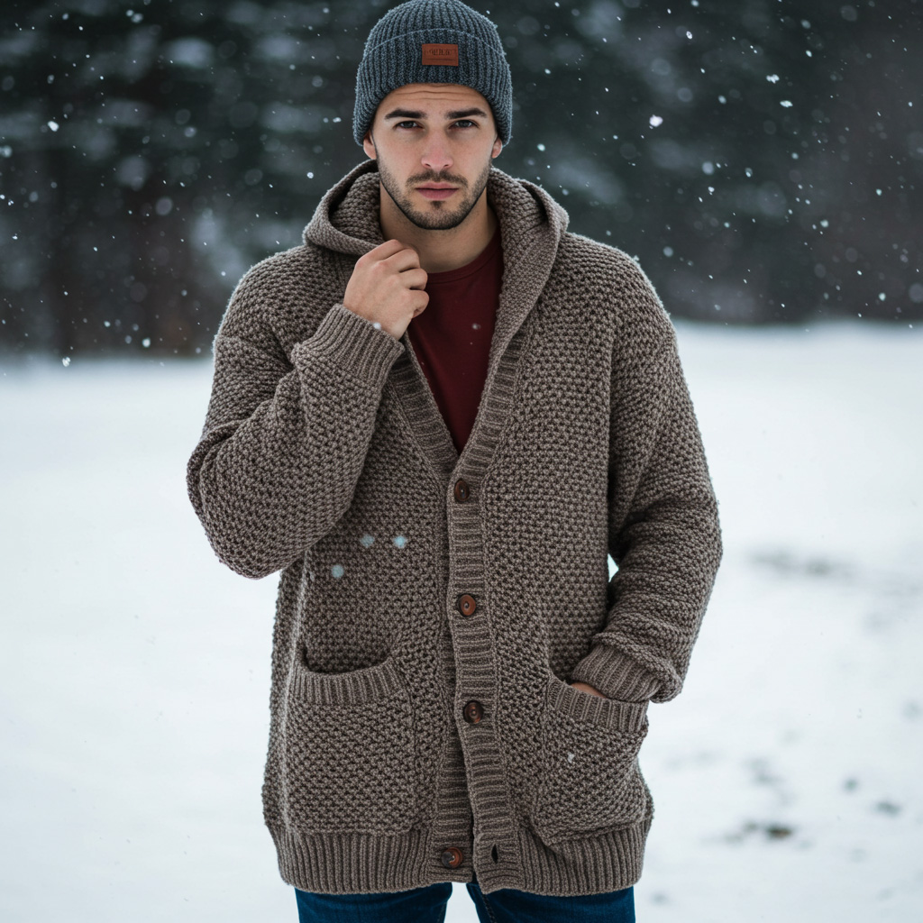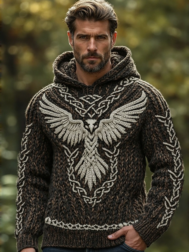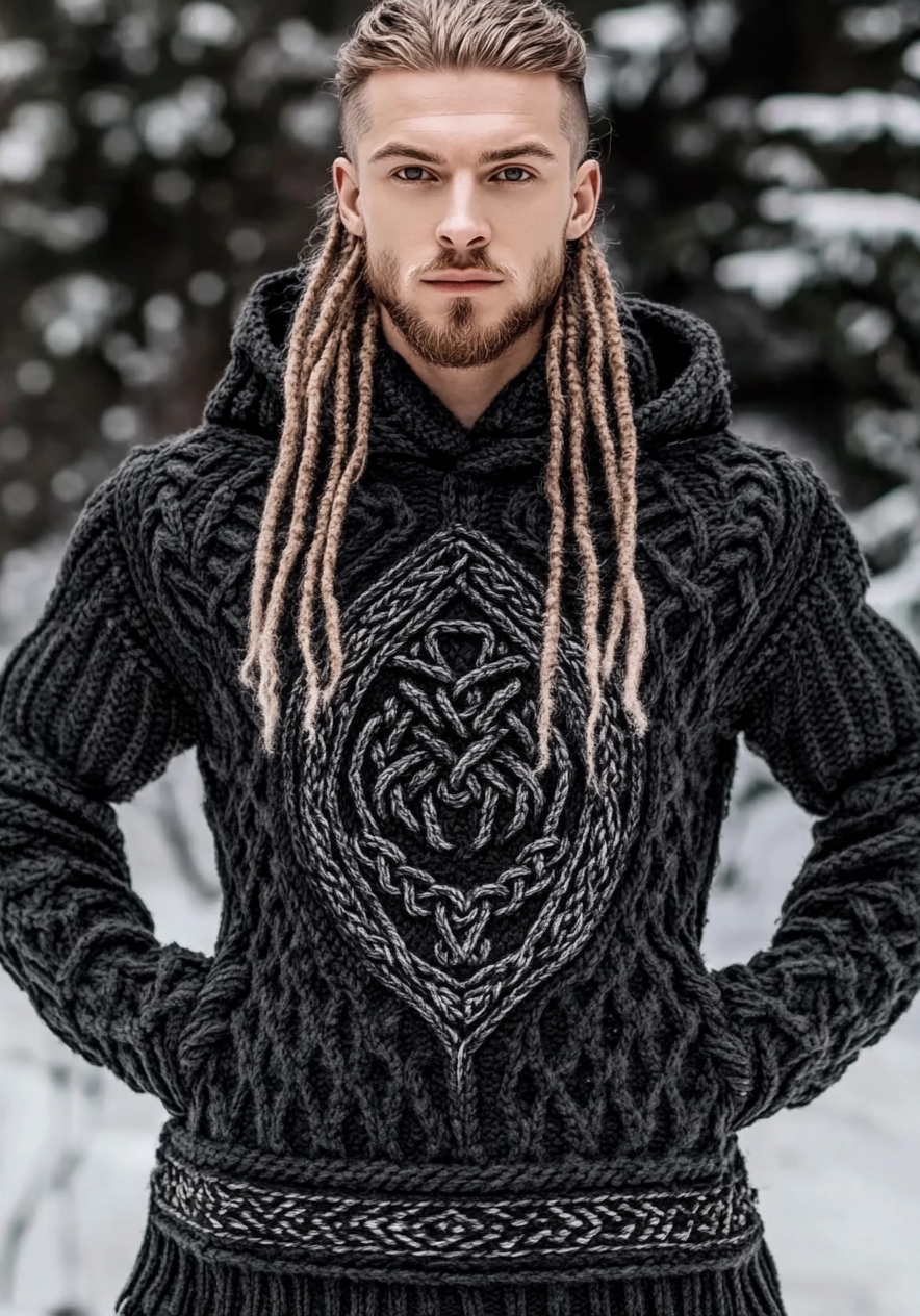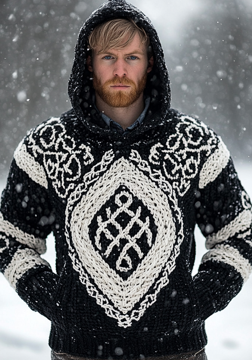 Men's Vintage Viking Celtic Jacquard Chunky Hooded Sweater
