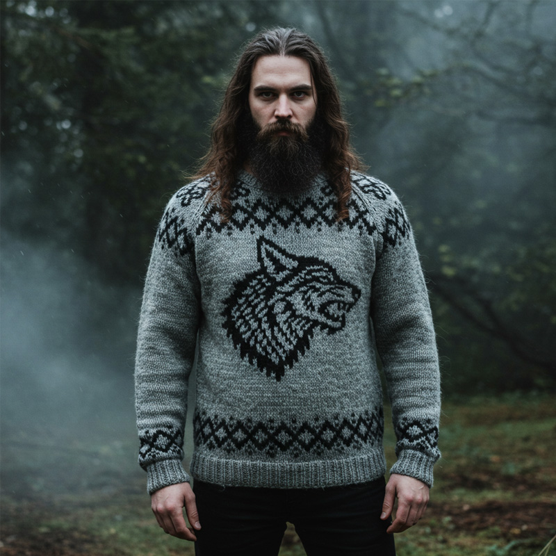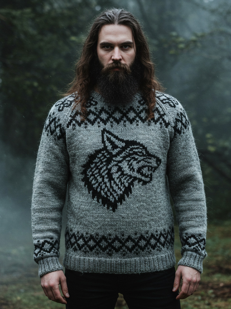 Men's Wolf Inspired Viking Celtic Jacquard Cozy Chunky Sweater