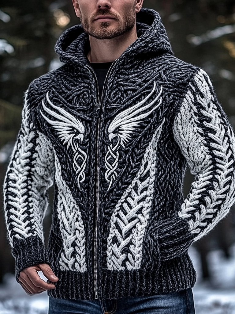 Men's Viking Bird Style Celtic Thick Zip Hooded Sweater