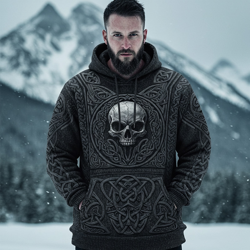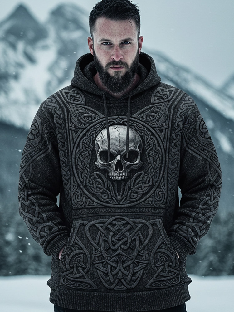 Men's Viking Tribal Skull Rune Celtic Inspired Knit Hooded Sweater