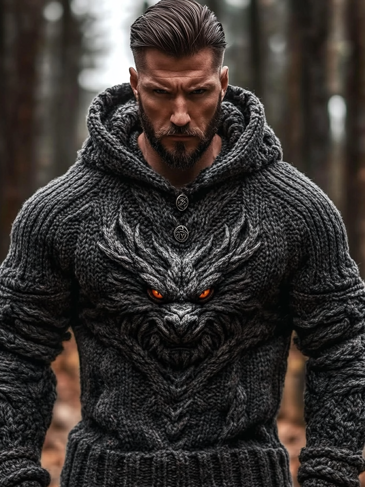 Men's Wolf Inspired Viking Celtic Chunky Hooded Sweater